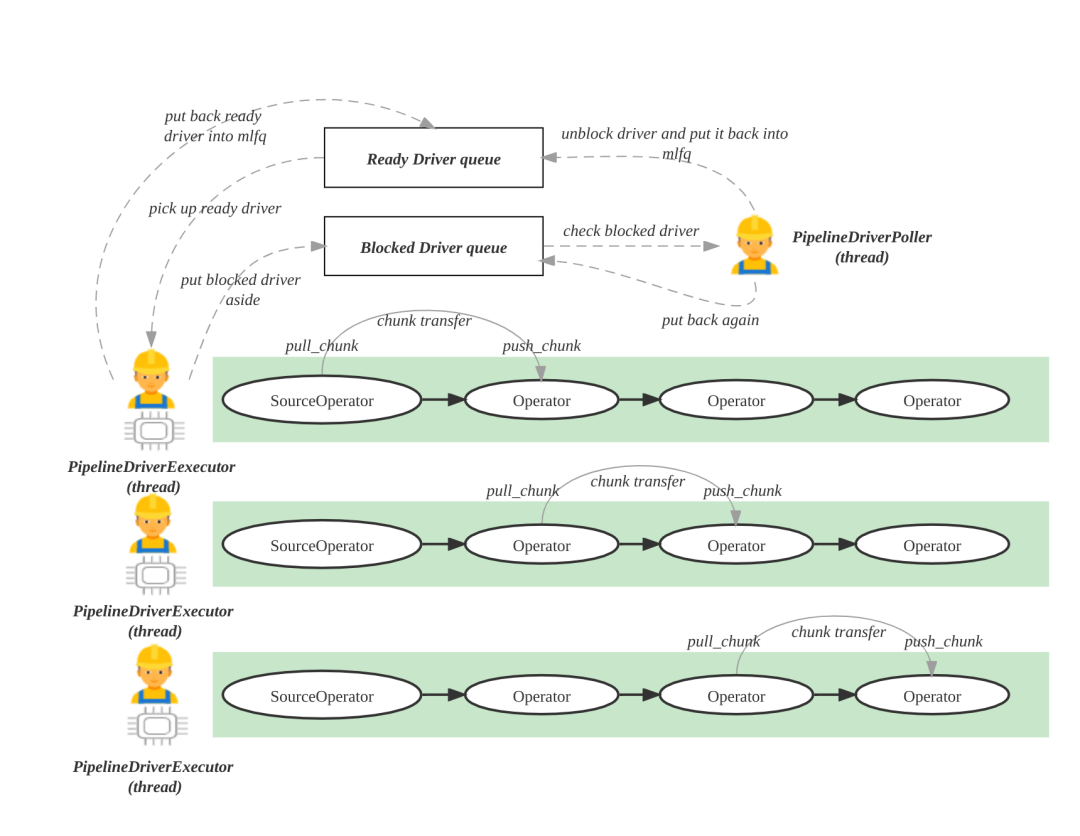 执行线程 PipelineDriverExecutor:不断地从就绪 Driver 队列中获得就绪态的 PipelineDriver 并执行,把主动让出 CPU 的PipelineDriver 再次放回就绪 Driver 队列,把处于阻塞态 PipelineDriver 放入阻塞 Driver 队列。