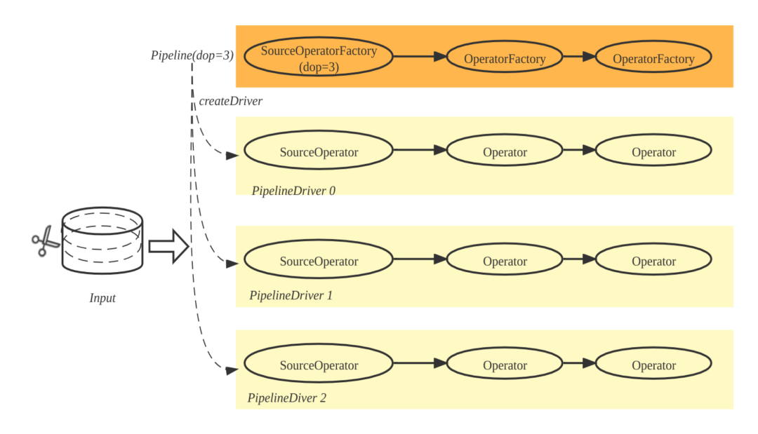 PipelineDriver 是 Pipeline 实例,一条 Pipeline 可以产生多个 PipelineDriver。在代码实现中,Pipeline 由一组 OperatorFactory 构成, Pipeline 可以调用 OperatorFactory 的 create 方法,生成一组 Operator,这组 Operator 即构成 PipelineDriver。如下图所示,根据 dop=3(degree-of-parallelism),Pipeline 实例化 3 条 PipelineDriver,输入数据也被拆分成三部分,每个 PipelineDriver 各自处理一部分。