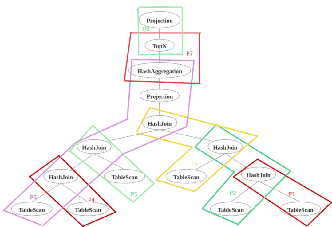 以 TPCH-Q5 为例,执行计划,可以划分成若干条 Pipeline,Pipeline 之间也存在上下游数据依赖。如下图所示: