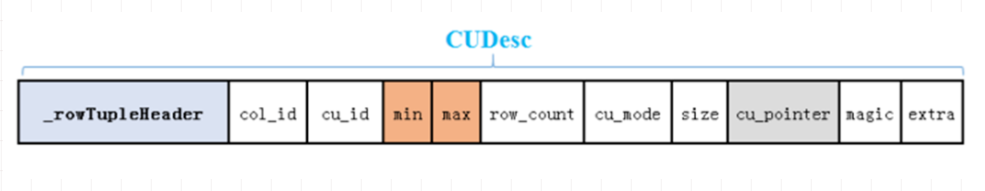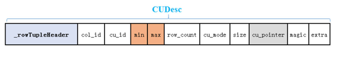 每个 CU 对应一个 CUDesc 的记录,在 CUDesc 里记录了整个 CU 的事务时间戳信息、CU 的大小、存储位置、magic 校验码、min/max 等信息。