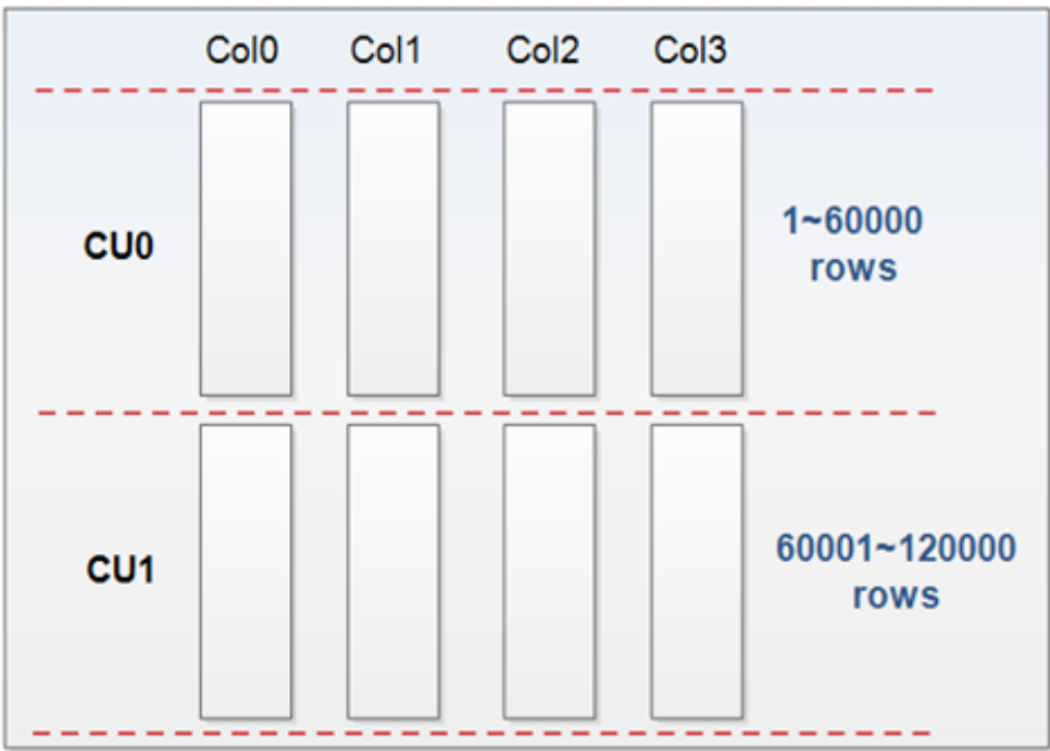 openGauss 列存储引擎的底层存储结构与 Tianmu 引擎类似 ,存储基本单位是CU(Compression Unit,压缩单元),即表中一列的一部分数据组成的压缩数据块。行存引擎中是以行作为单位来管理,而当使用列存储时,整个表整体被按照不同列划分为若干个CU。