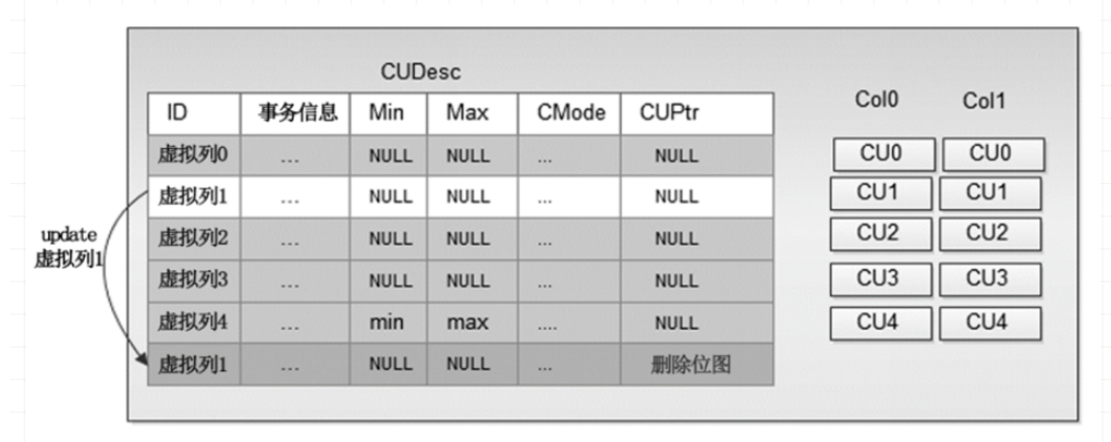 CU 中数据的删除,实际上是标记删除。删除操作,相当于是更新了 CUDesc 表中 CU 对应 CUDesc 记录的 delete bitmap(删除位图)结构,标记列中某行对应数据已被删除,而 CU 文件数据不会被更改。这样可以避免删除操作带来的 IO 放大以及解压、压缩的高额 CPU 开销。这样的设计,也可以使得对于同一个 CU 的 select(查询)和 delete(删除)互不阻塞,提升并发能力。列存储 CU 中数据更新,则是遵循 append-only(仅允许追加)原则的,即 CU 文件仅会向后进行延展扩充,亦或是启用新的 CU 文件,而不是在对应行在 CU 中的位置就地更新。