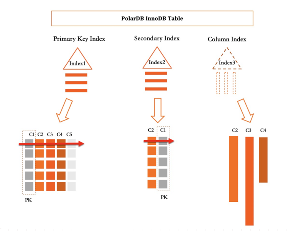 在 PolarDB 中所有 Primary Index 和 Secondary Index 都实现为一个 B+Tree。列索引在定义上是一个 Index,但其实是一个虚拟的索引,用于捕获对该索引覆盖列的增删改操作。