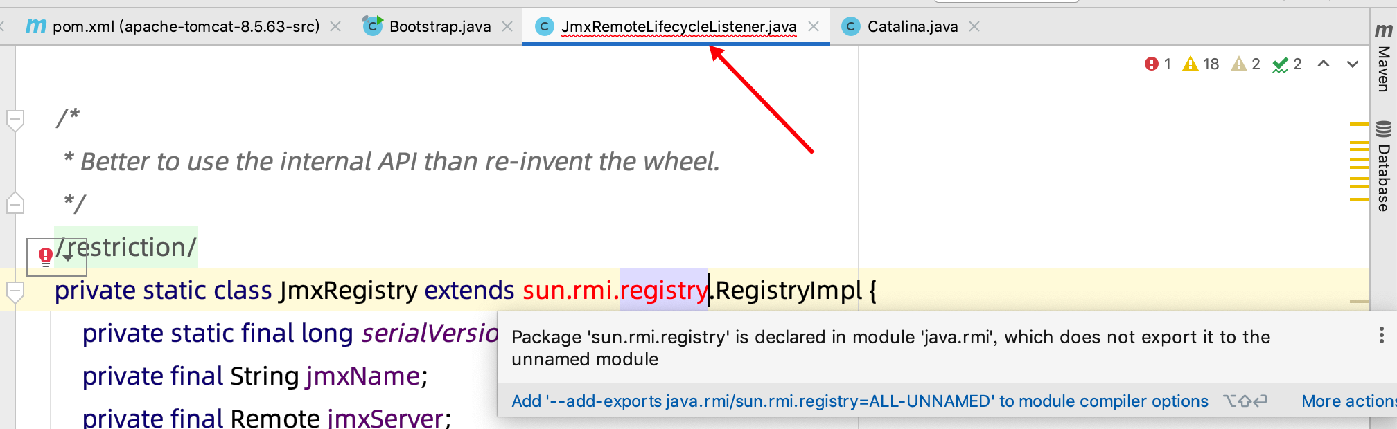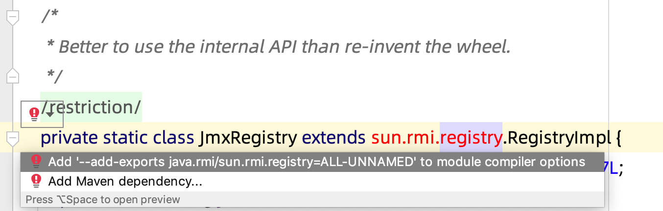 Error:(505, 53) java: 程序包 sun.rmi.registry 不可见 (程序包 sun.rmi.registry 已在模块 java.rmi 中声明, 但该模块未将它导出到未命名模块)