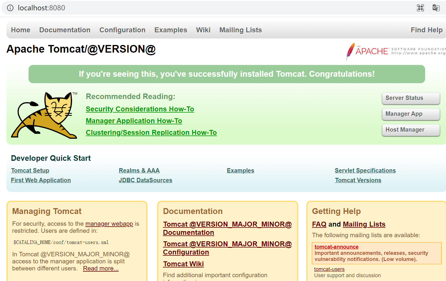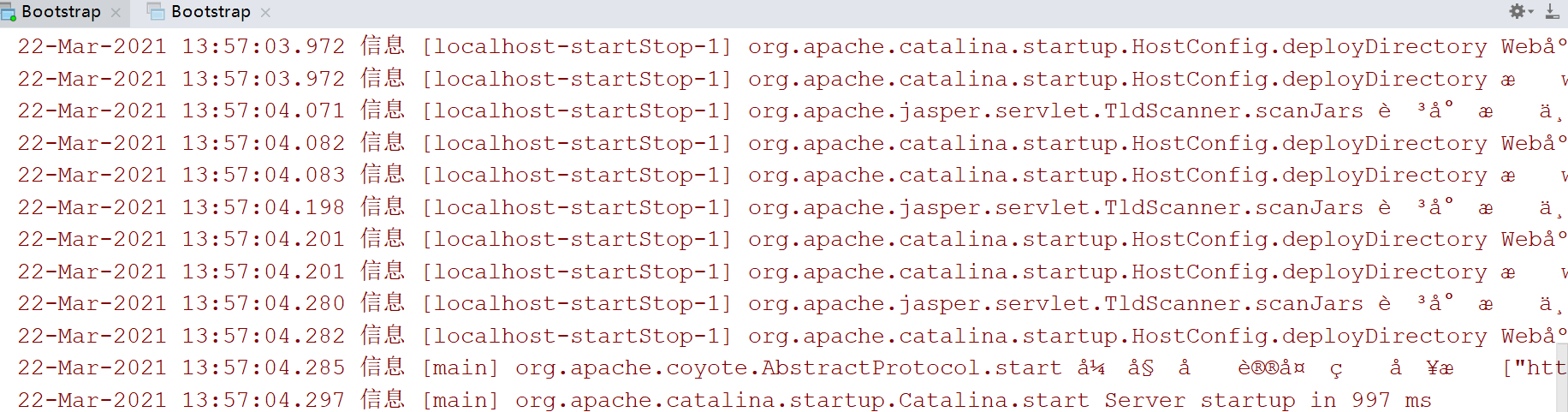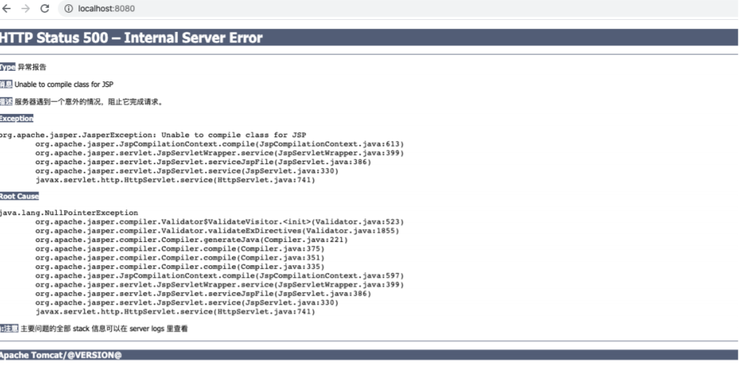 运⾏ Bootstrap 类的 main 函数,此时就启动了tomcat,启动时候会去加载所配置的 conf ⽬录下 的server.xml等配置⽂件,所以访问8080端⼝即可,但此时我们会遇到如下的⼀个错误