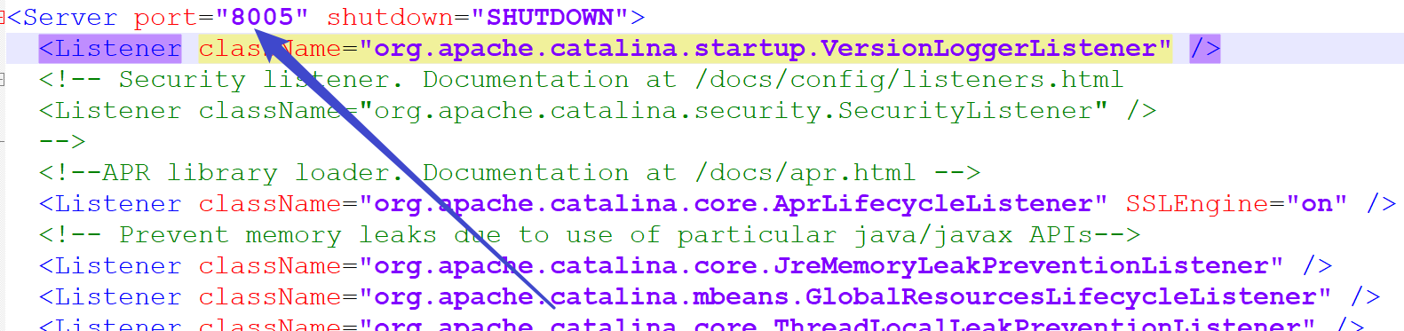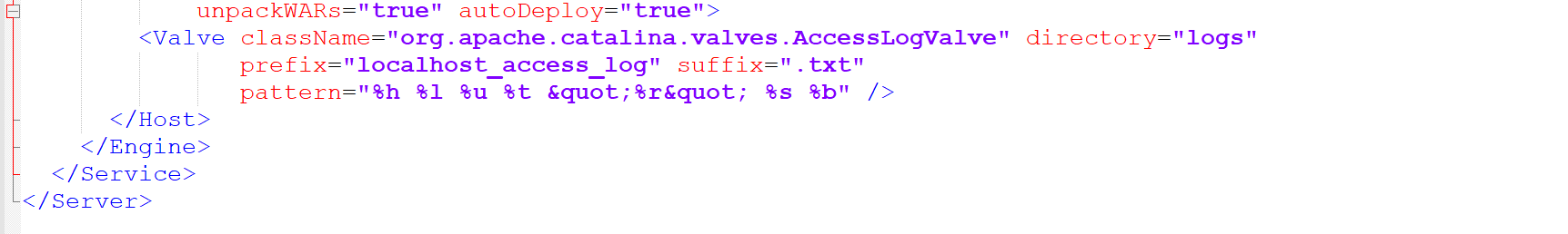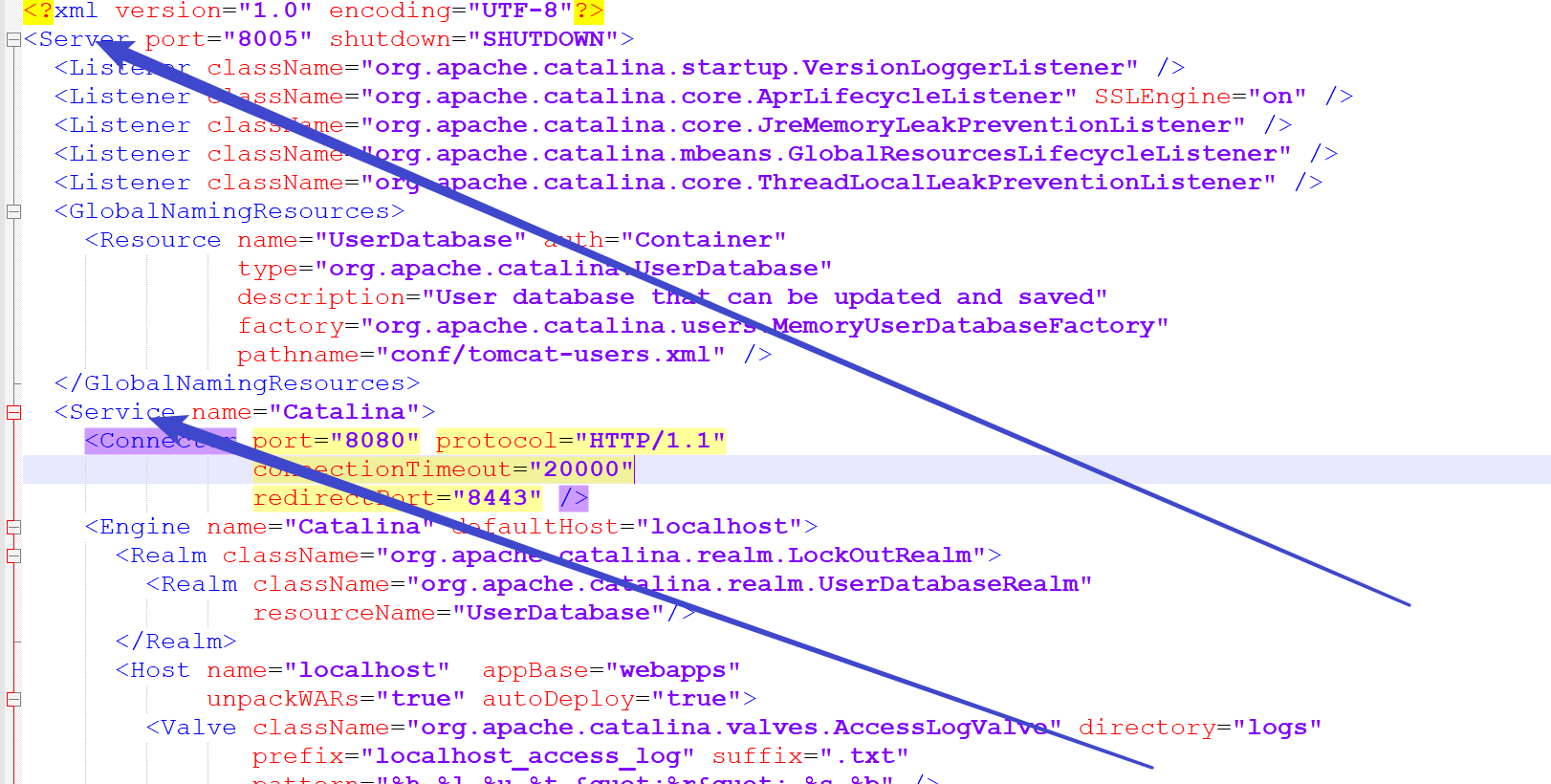 对照上面的关系图,一个Tomcat实例对应一个server,一个 Server 中有一个或者多个 Service,