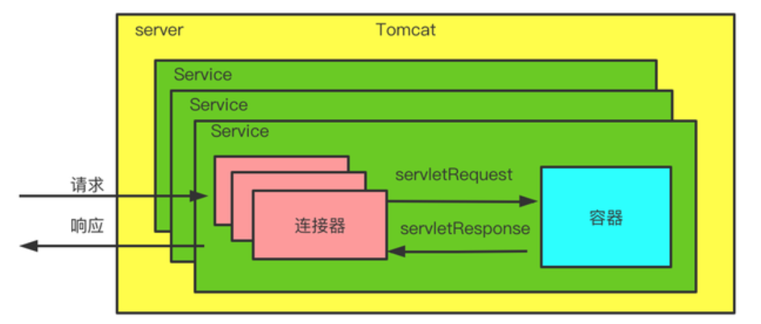 Service:Service是提供具体对外服务的(默认只有一个),一个Service容器中又可以有多个Connector组件(监听不同端口请求,解析请求)和一个Servlet容器(做具体的业务逻辑处理);