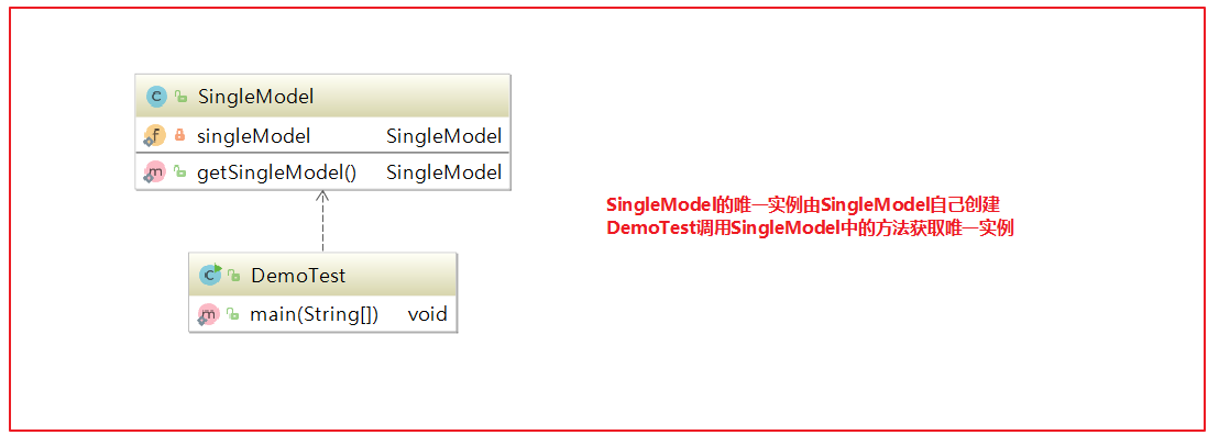 创建一个单例对象SingleModel,SingleModel 类有它的私有构造函数和本身的一个静态实例。