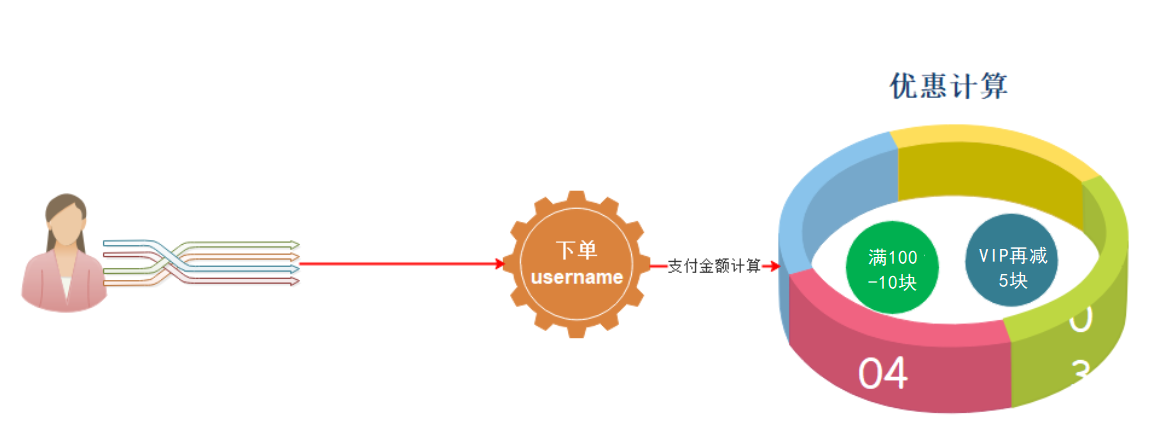 测试数据中,我们选择购买1件商品,当前登录用户为王五,拥有5个金币,当前购买的商品id=1,商品单价是150元,满减100,VIP优惠5元,最终支付135元。