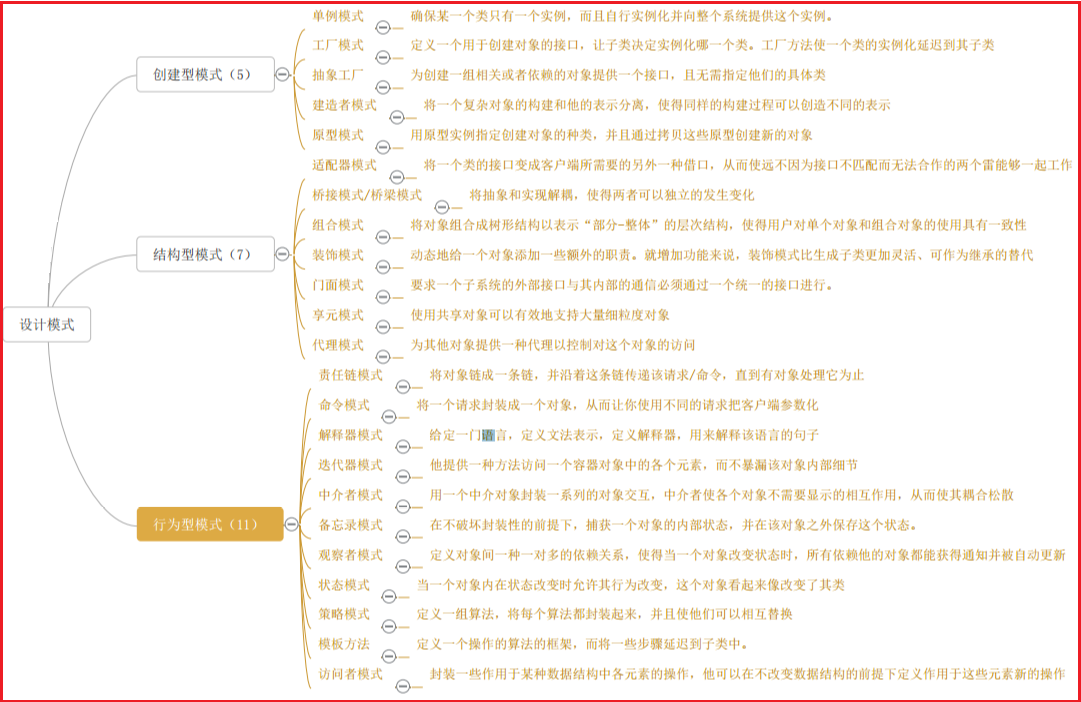 (3)行为型模式: 用于描述类或对象之间怎样相互协作共同完成单个对象都无法单独完成的任务,以及怎样分配职责。模板方法、策略、命令、职责链、状态、观察者、中介者、迭代器、访问者、备忘录、解释器11种设计模式属于行为型模式。