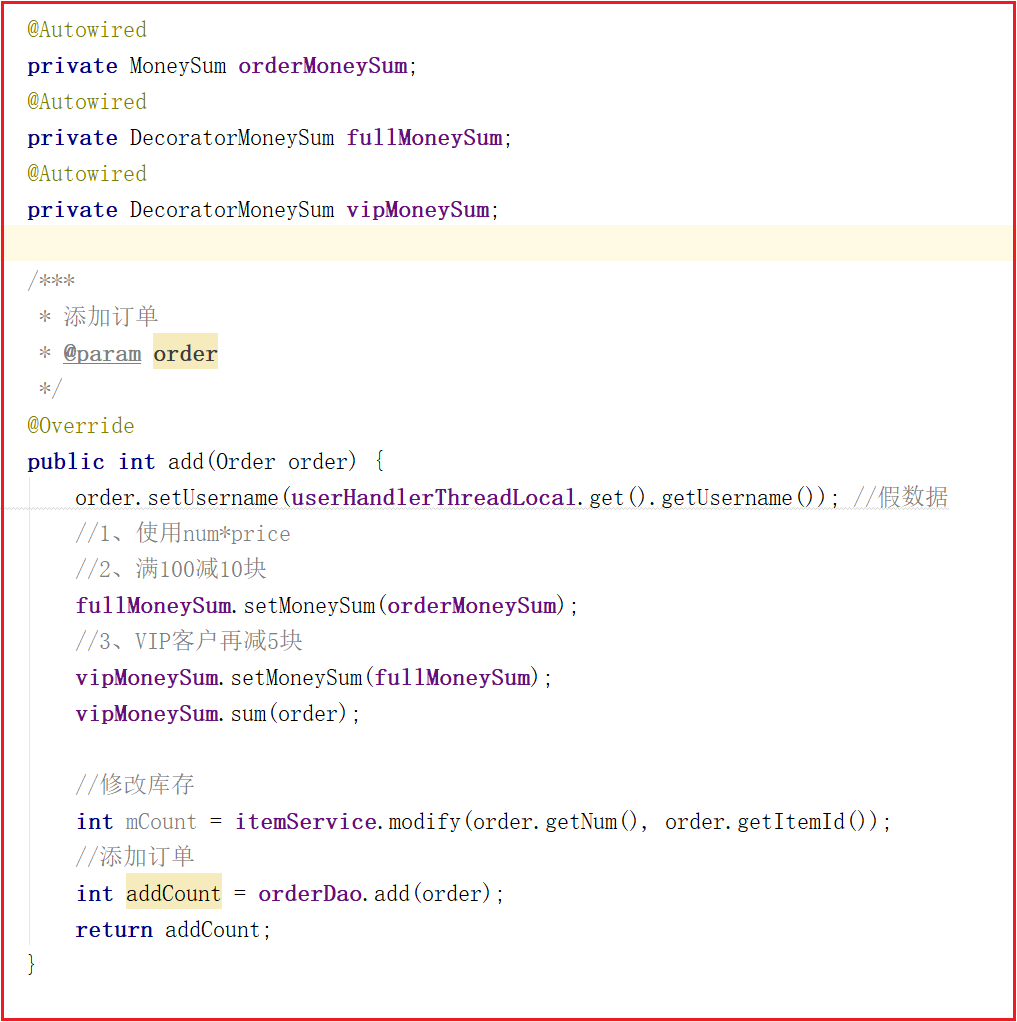 满100减10元价格计算:创建类FullMoneySum扩展装饰者类,实现满减价格计算。