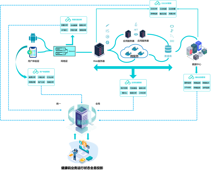 针对“绿码”的运行特点,为了能够保障用户能够在需要“亮码”时保持快速响应,云智慧推出了以压测宝、透视宝产品为基础,并结合使用场景形成立体化运维解决方案,针对各类复杂IT系统提供全方位的监控运维保障,为健康码业务保驾护航。