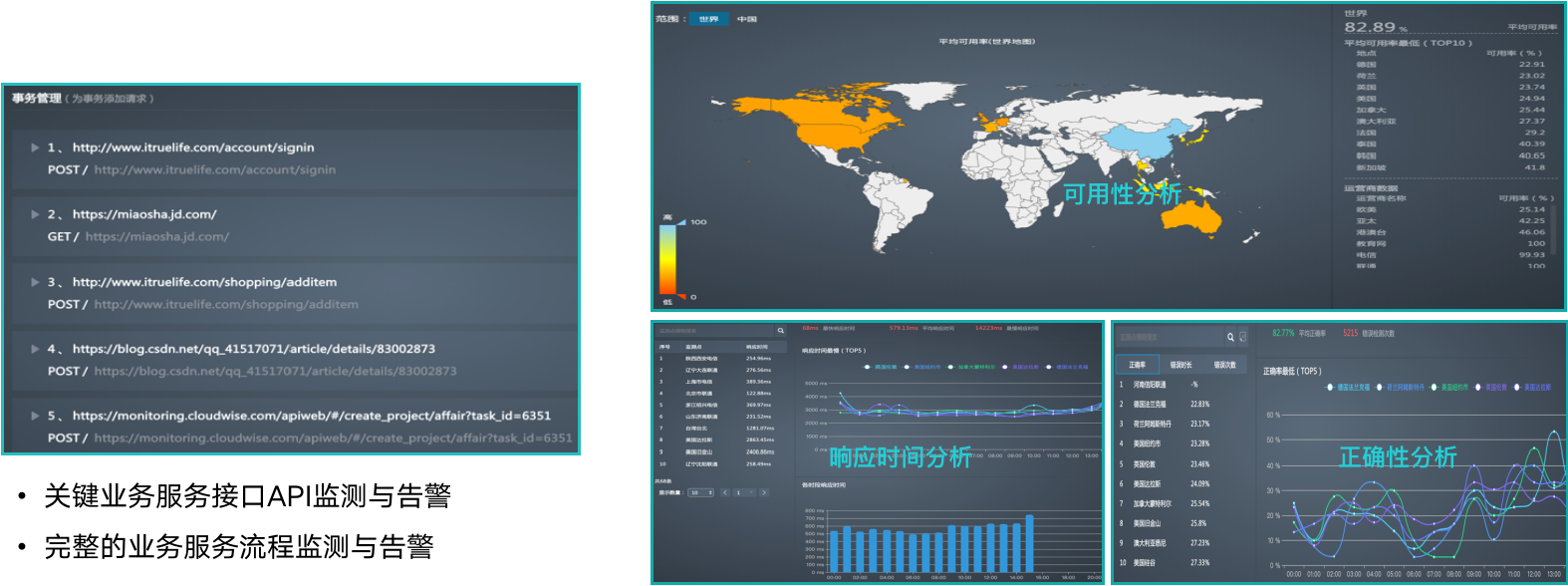 实现对关键业务服务接口API、完整的业务服务流程进行有效监控,化被动为主动,保证服务质量。
