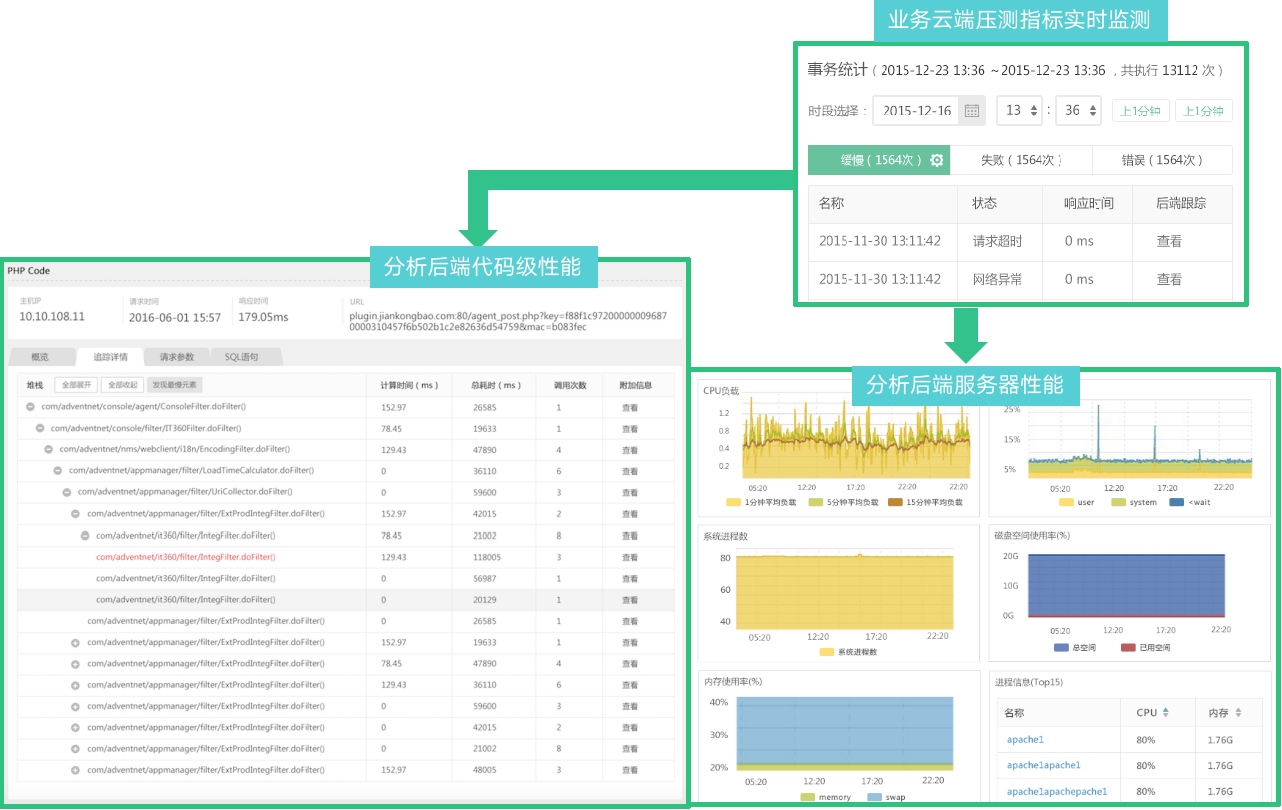 与立体化监控紧密结合,实现问题快速发现:云压测与立体化监控高度融合,在加压同时深入分析端到端体系架构的整体性能,实时定位代码级性能瓶颈,分析硬件资源利用率指标。