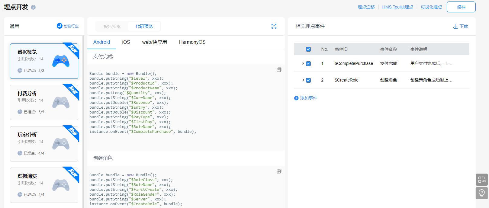 在游戏行业中,数据采集不全面、缺乏挖掘能力等痛点是厂商自建数据中台一直难以解决的技术难题。为进一步满足更多细分游戏品类的精益运营诉求,HMS Core分析服务在原有卡牌、MMO等细分游戏品类行业报告的基础上,新增通用游戏行业报告。提供完整的游戏指标数据体系搭建,并配套对应的埋点模板和代码样例,帮助开发者随时掌握游戏的核心数据表现。