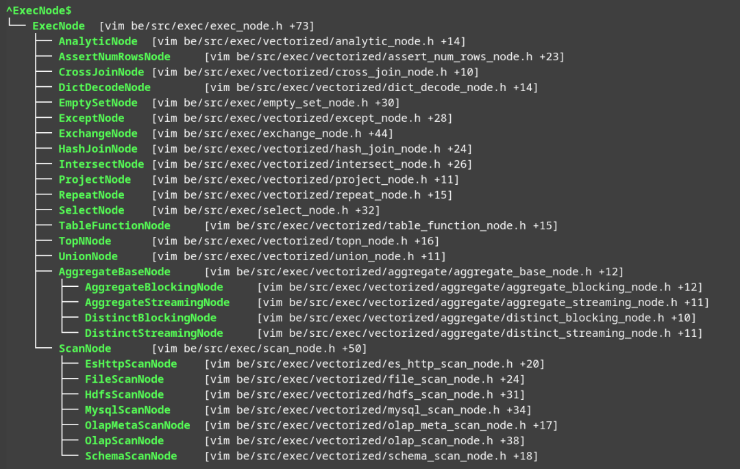 物理算子是 ExecNode 的子类,FE 投递给 BE 的 Fragment Instance 中,包含构成所属 PlanFragment 的物理算子, 物理算子如下图所示: