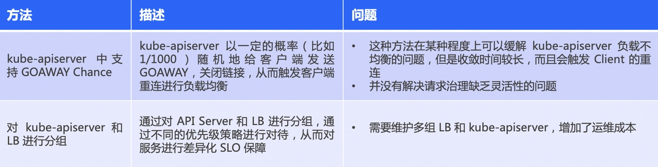 - 请求负载不均衡:由于 kube-apiserver 和 client 是使用 HTTP2 协议连接,HTTP2 的多个请求都会复用底层的同一个 TCP 连接并且长时间不断开。在 kube-apiserver 滚动升级或者某个实例重启时,很容易引起迟些启动的 kube-apiserver 在长时间内只有很少的请求数。极端情况下,负载较高的实例会出现 OOM,甚至引起雪崩。