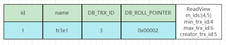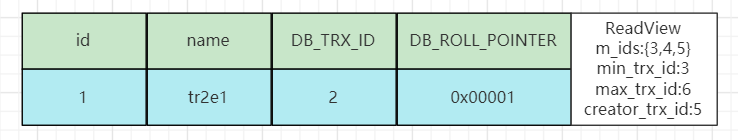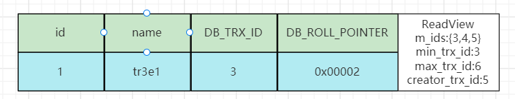 事务5第一次进行查询时生成的ReadView以及原数据如下图: