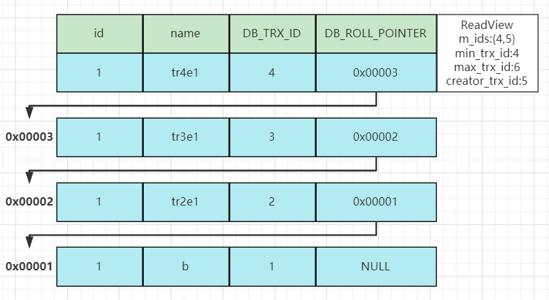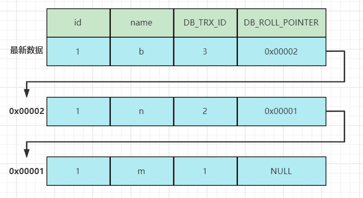 当有多个并发事务操作一行数据时,对这行数据的修改会产生多个版本,多个版本通过上述的一个隐藏字段DB_ROLL_PTR回滚指针指向Undo Log数据地址形成一个链表,即MVCC版本链。