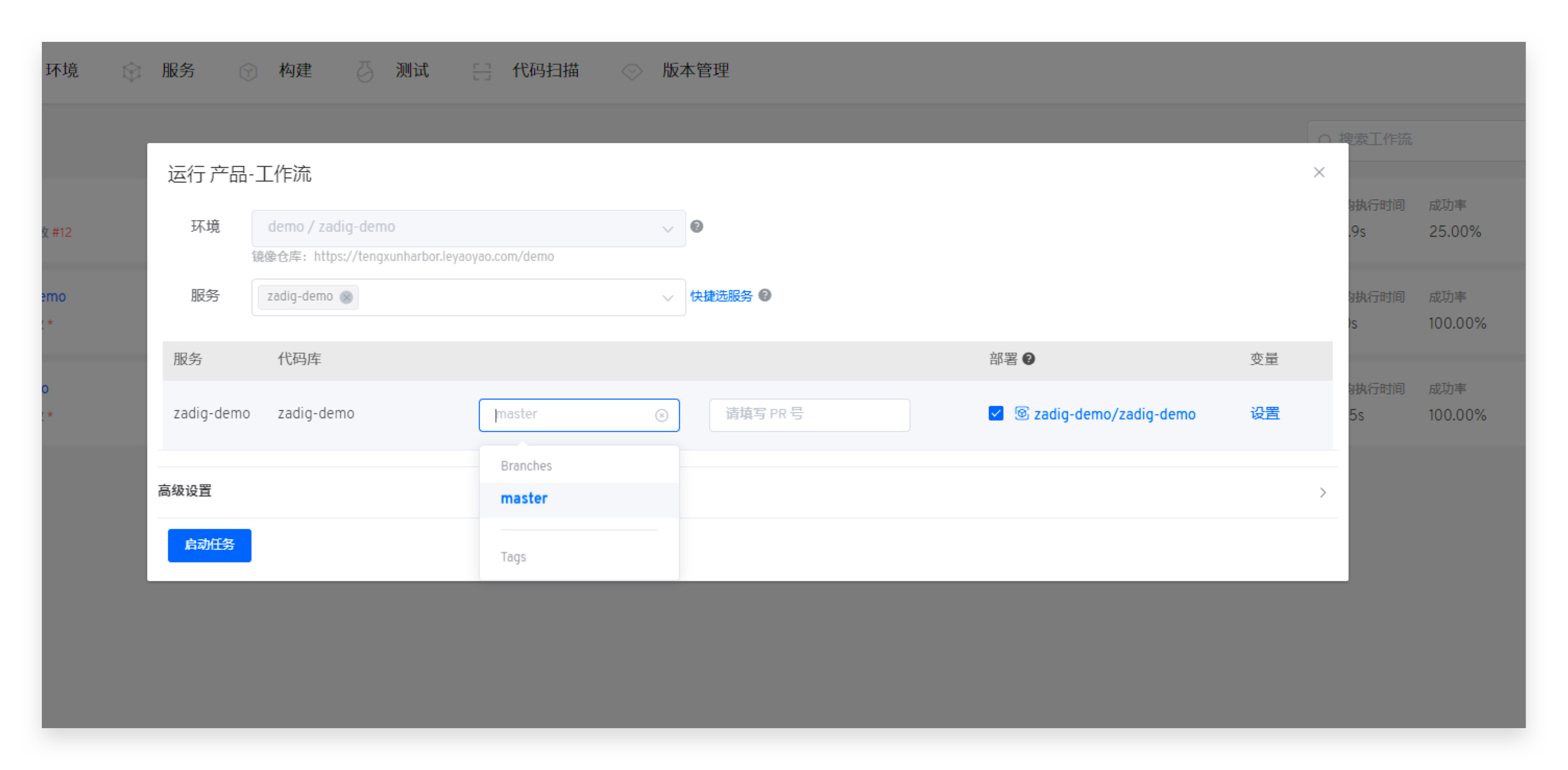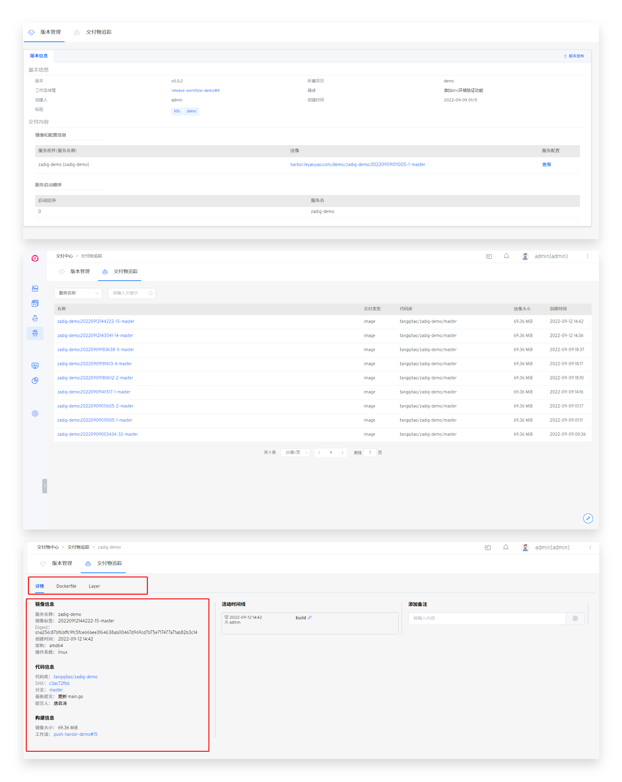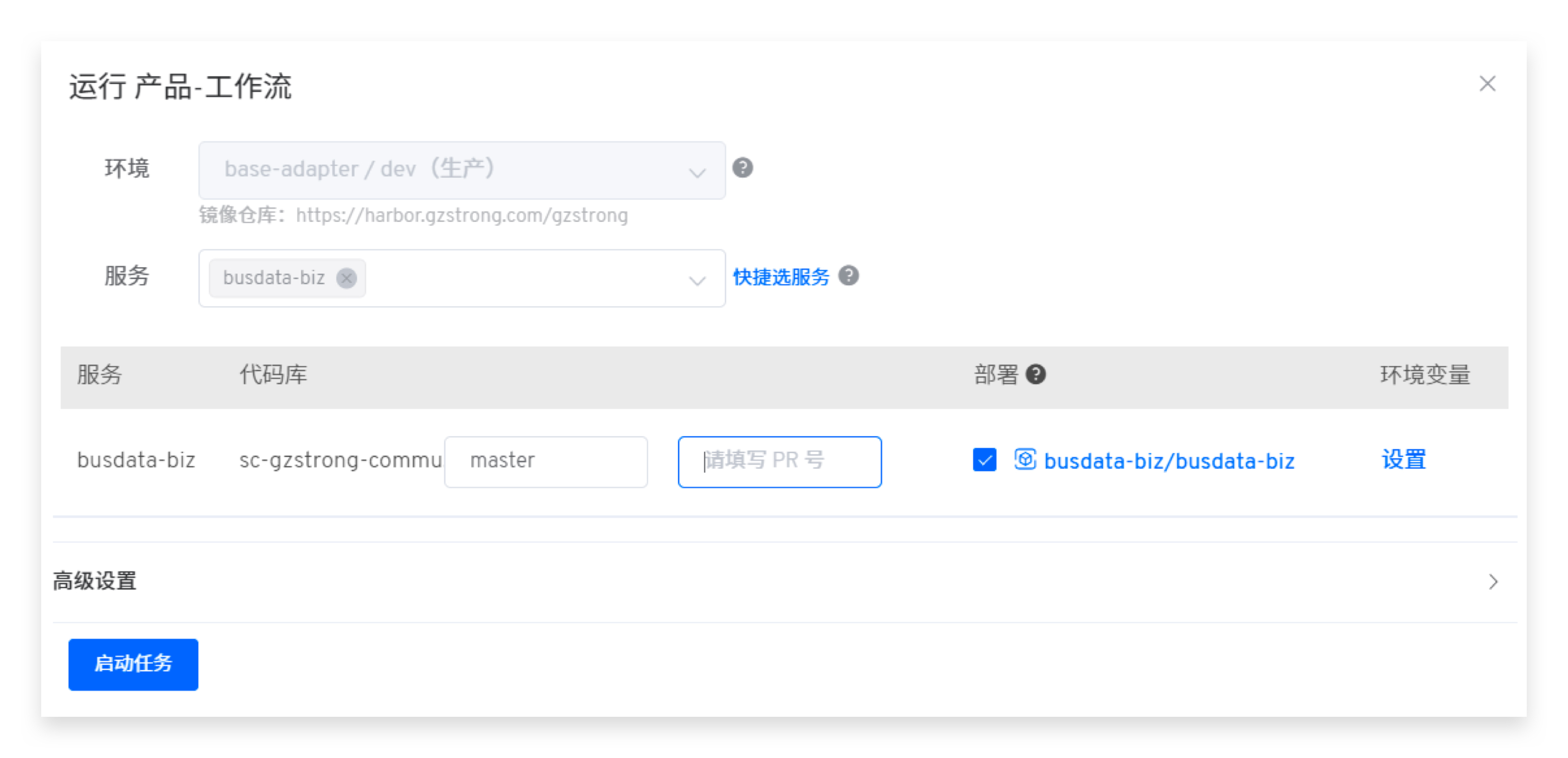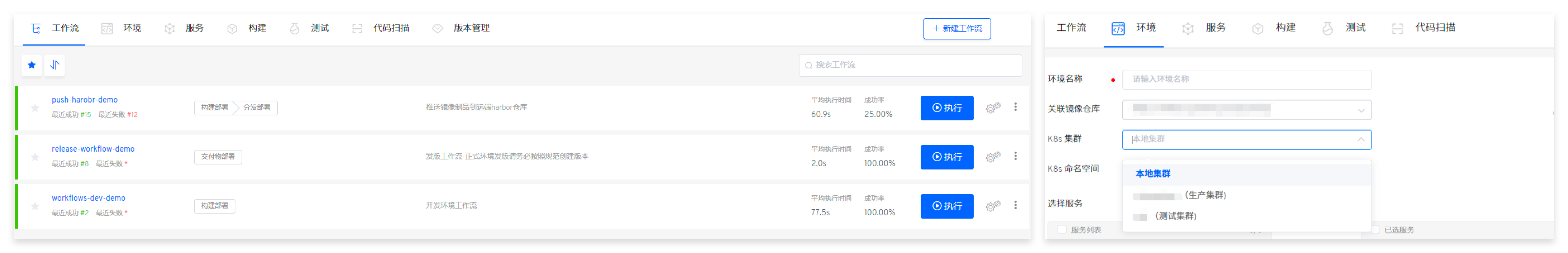可以通过对 Harbor 的整合,实现不同环境的发布,就比如:正式环境只需要托管,无需配置其他的构建信息,工作流执行构建上传到指定的 Harbor,正式环境不需要打包更新,直接更换 镜像 制品 。