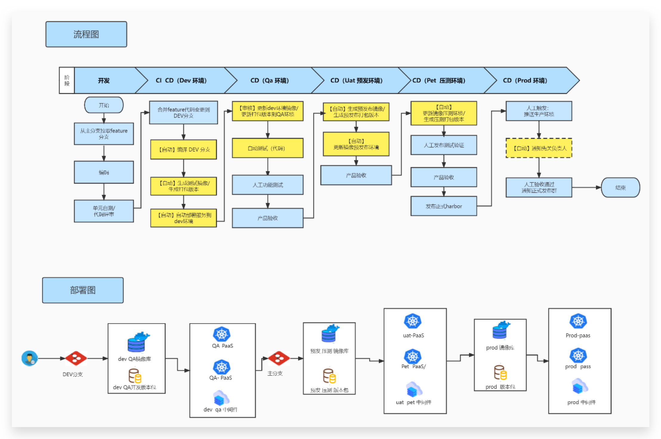 Zadig 就是专门用来做效能的一款开源 CI/CD 平台。我十分认可 Zadig 的使命:工程师是数字经济最重要的资产,Zadig 让工程师专注企业创新。他可以完美的解决我们迁移 K8s 后的 一系列 问题。如果加以规划和使用,可以用如下流程图来概括: