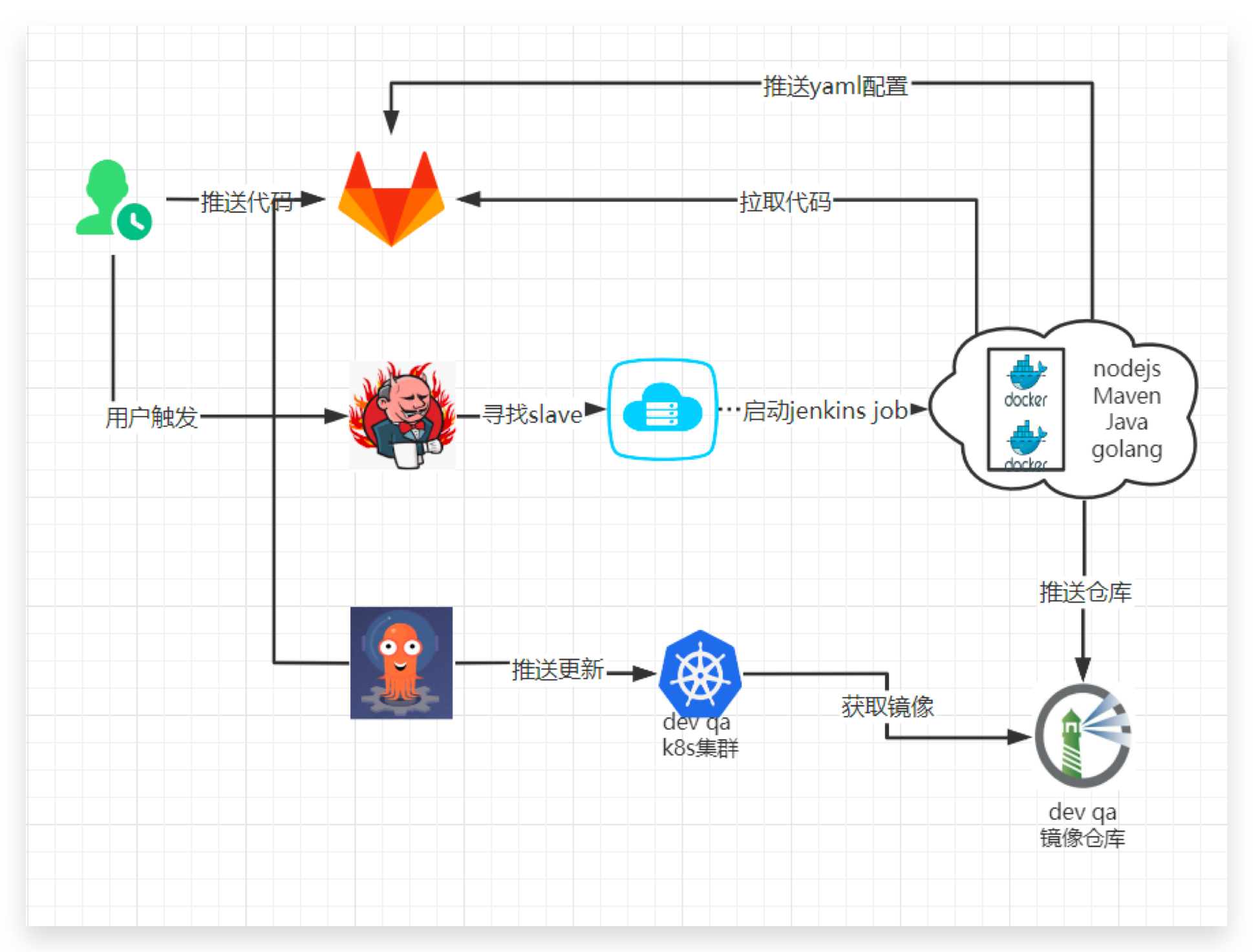 - CI/CD:意味着能够完整的走完一整套交付,包含代码的拉取,制品的生成存储以及服务的部署。