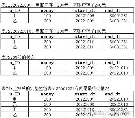 SELECT * FROM T1 WHERE create_dt=‘20221010’; 1 3、拉链表 拉链表储存了某个主体的一整套连续动作的信息。与快照表类似,但拉链表储存的是在快照表的基础上去除了重复状态的数据。他是一种维护历史状态,以及最新状态数据的一种表,记录数据从开始一直到当前状态所有变化的信息。