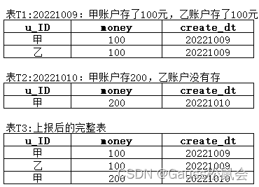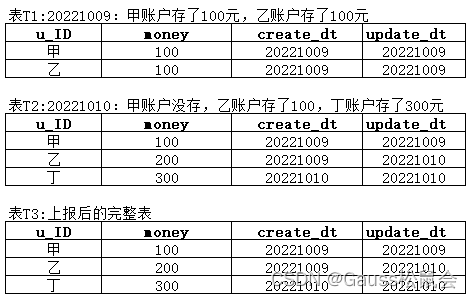 增量表范例: 增量表,就是记录每天新增数据的表。比如:从9号到10号新增了哪些数据,改变了哪些数据,这些都会存储在增量表在10号的分区里面(下表中的create_dt 可作为分区字段)。