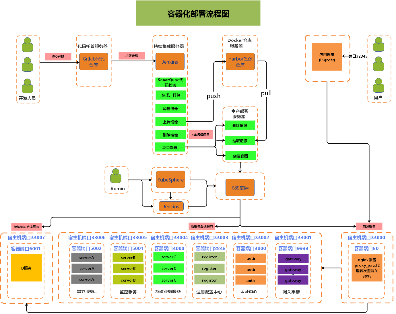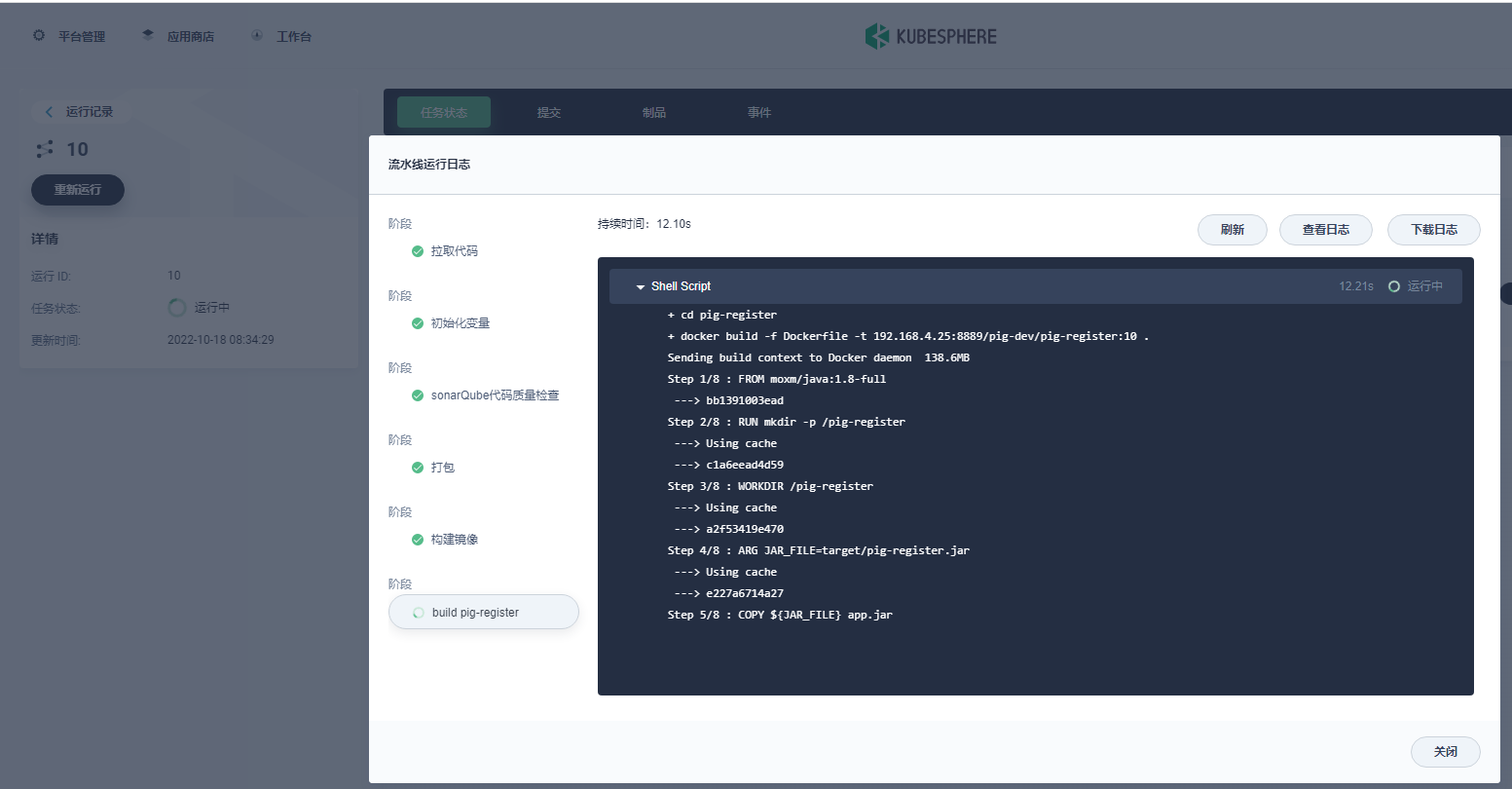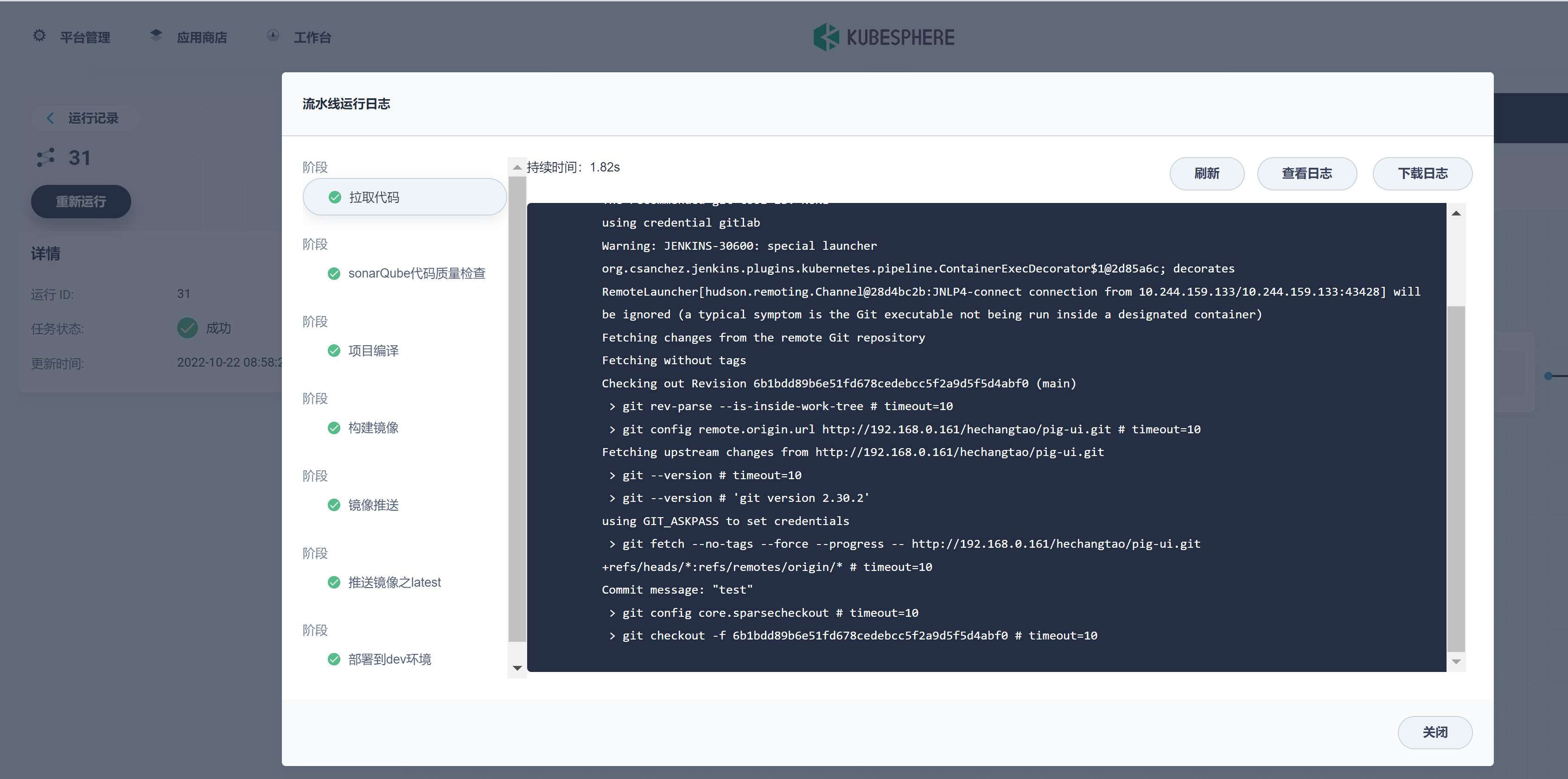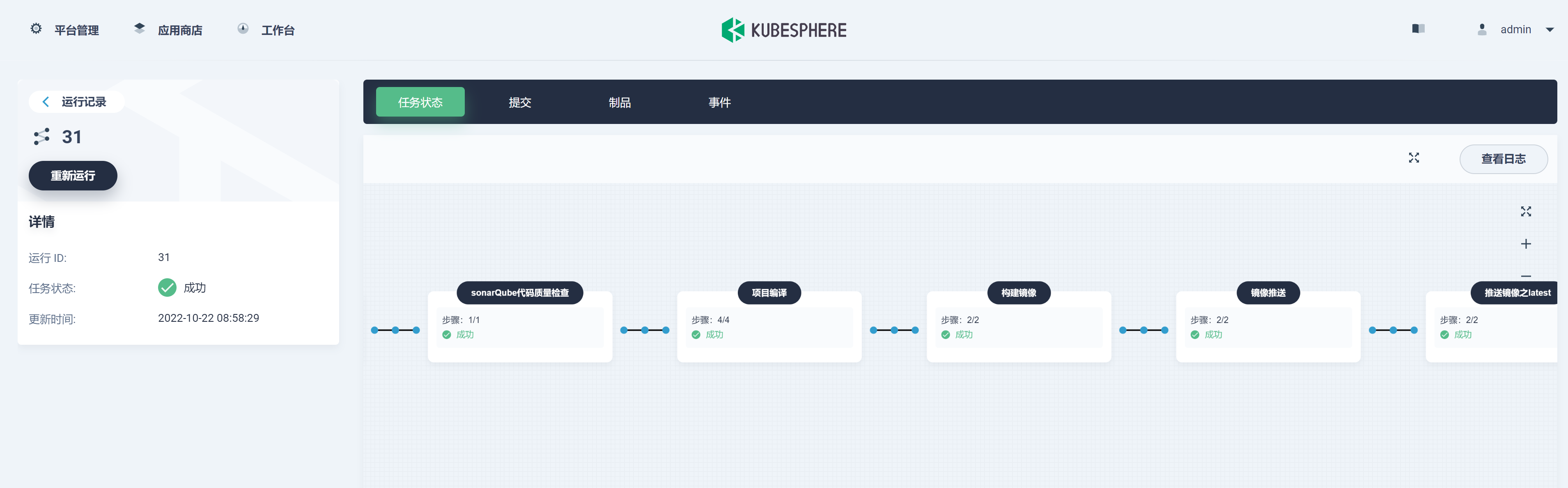 运维人员可通过 KubeSphere 来管理服务,也可以利用 KubeSphere 中的 Jenkins 来发布制品。如下所示: