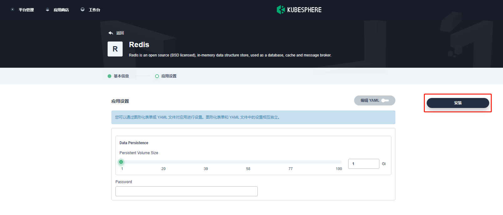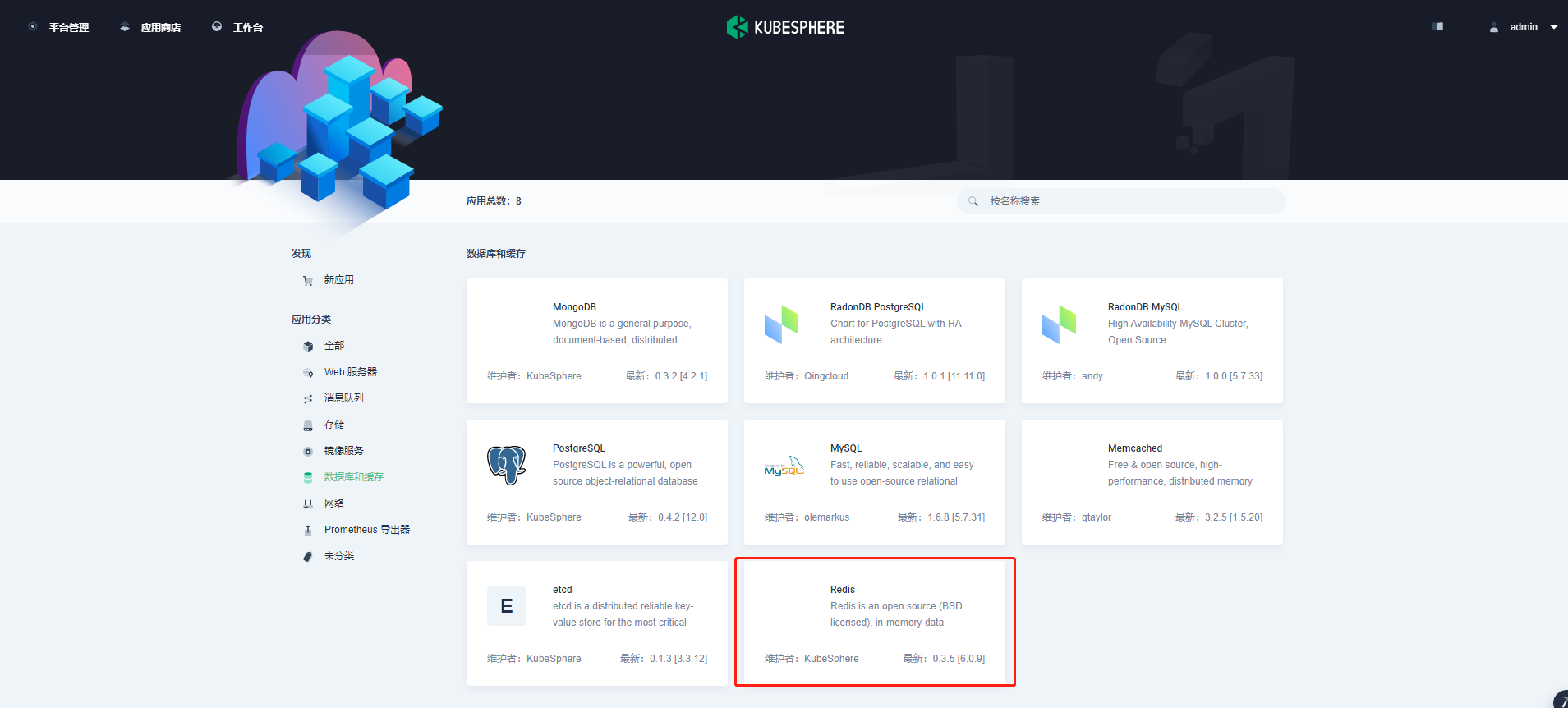 - 进入应用商店,在应用分类中选择数据库和缓存,找到 Redis。如下所示: