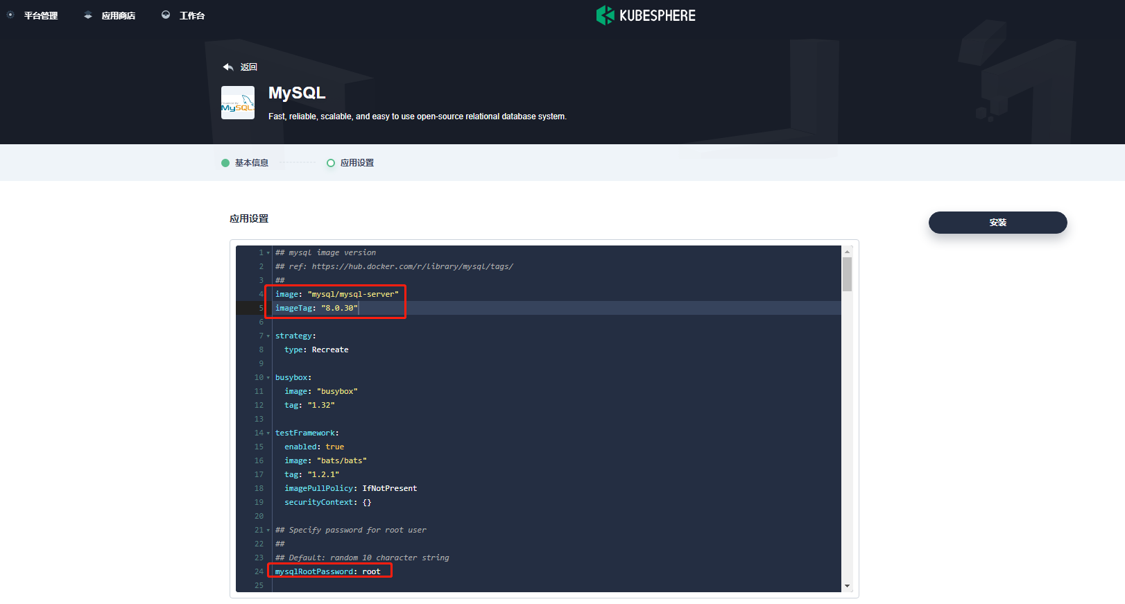 - 在应用配置中,编辑 yaml 文件 , 将镜像改为 MySQL/MySQL-server:8.0.30,将密码设置为 root。如下所示: