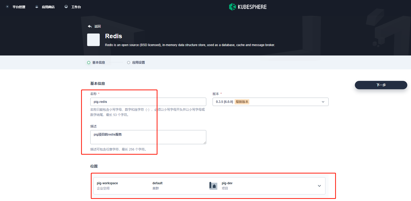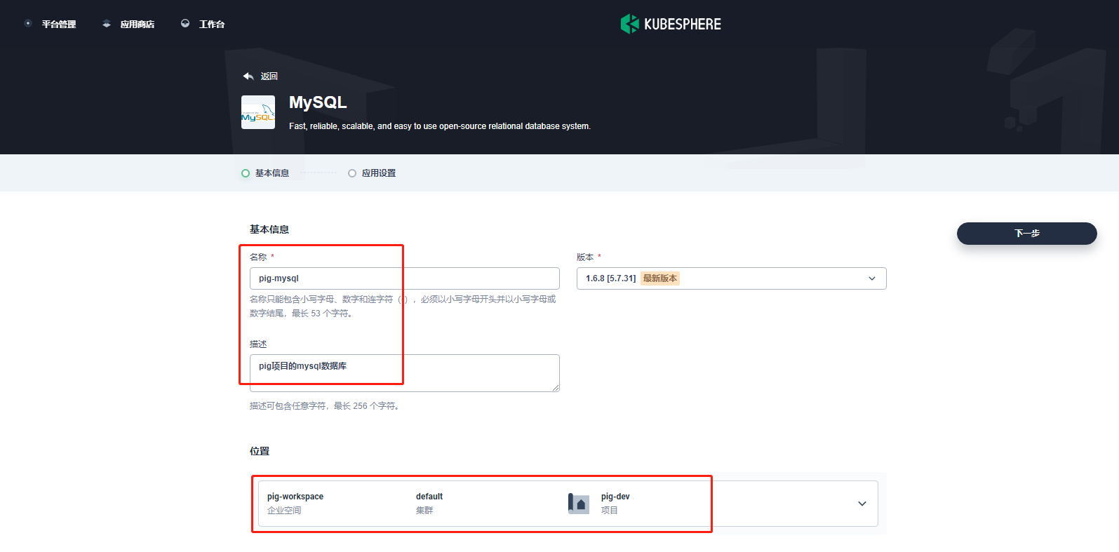 - 在基本信息中,填写应用名称 pig-MySQL, 并选择位置,进行下一步。如下所示: