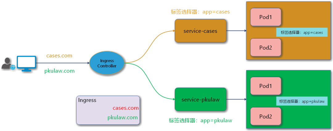其实就是将原架构加上一层 Ingress, 在 KubeSphere 中对应的是应用路由(Ingress 路由规则)和项目网关(Ingress Controller)。如下所示: