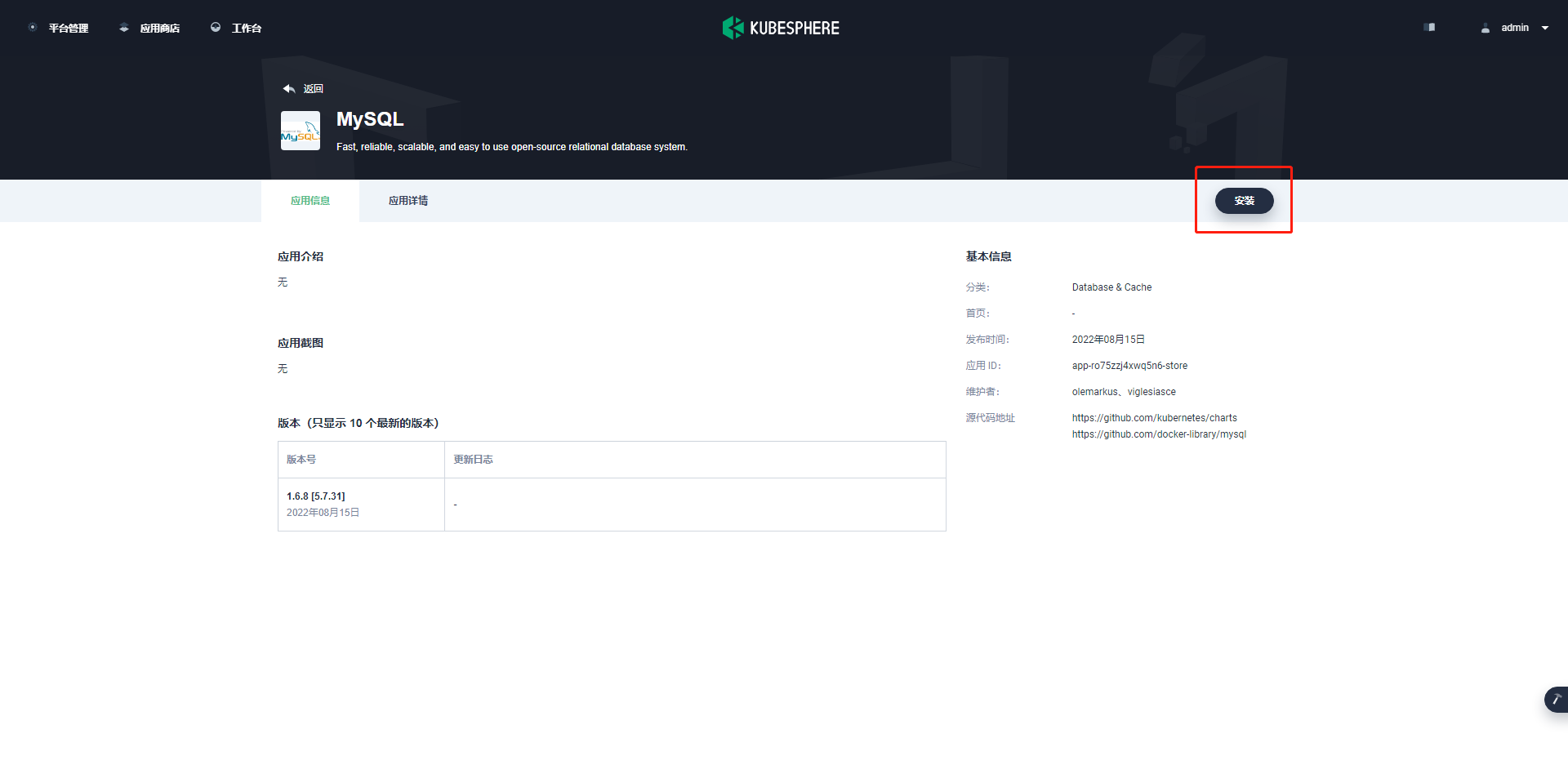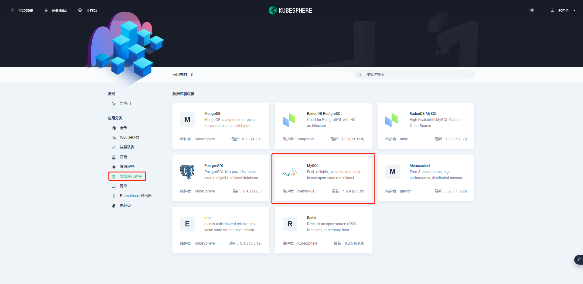 - 进入应用商店,在应用分类中选择数据库和缓存,找到 MySQL。如下所示: