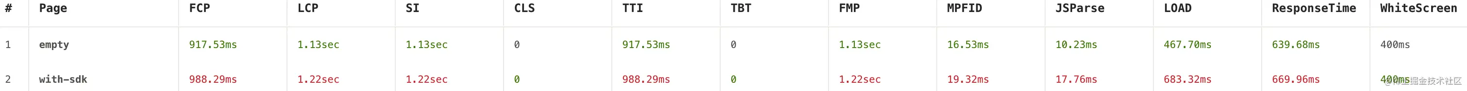 在实际的 lab 性能扫描结果中,我们可以看到两个页面所有性能指标的对比。我们发现 sdk 的注入在 mobile profile(4倍降频) 下还是给业务带来了 fcp 70ms、lcp 90ms、load 200ms 的劣化。