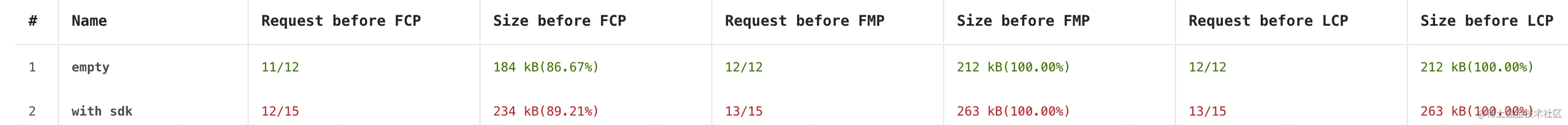 同时我们还可以观察到注入了 sdk 之后,fmp 和 lcp 之前的请求仅多了1个,这是符合预期的。不过这仍是我们保持观察的指标之一,因为在一些中低端的环境中,页面加载完成之前每发出一个请求就可能让业务更高优先级的请求被延后,从而引起页面性能指标的下降。