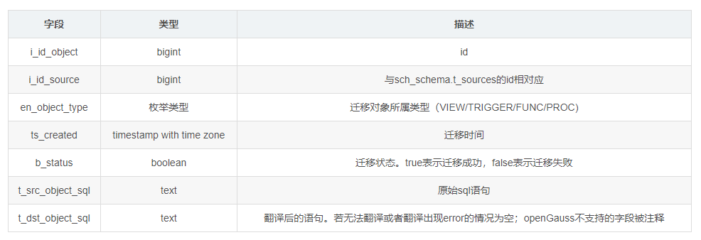 此外,工具还提供了可以在对象迁移信息表sch_chameleon.t_replica_object中查看迁移对象的记录能力。下表展示了t_replica_object表的字段说明。