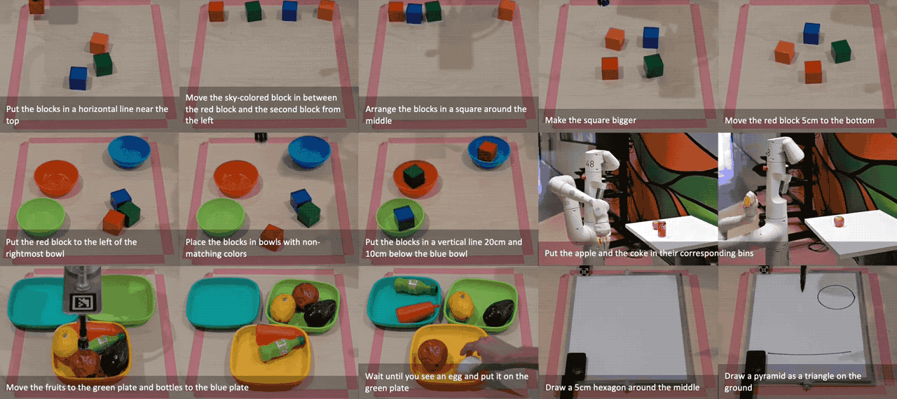 Google 研究人员在内部评估中测试了 CaP 的功能,在上图展示的测试中(第一排第三个),研究人员向 CaP 下达了 "将积木在中间摆成一个正方形" 的指令后,CaP 成功地生成了代码,使机器人能够重新排列积木。