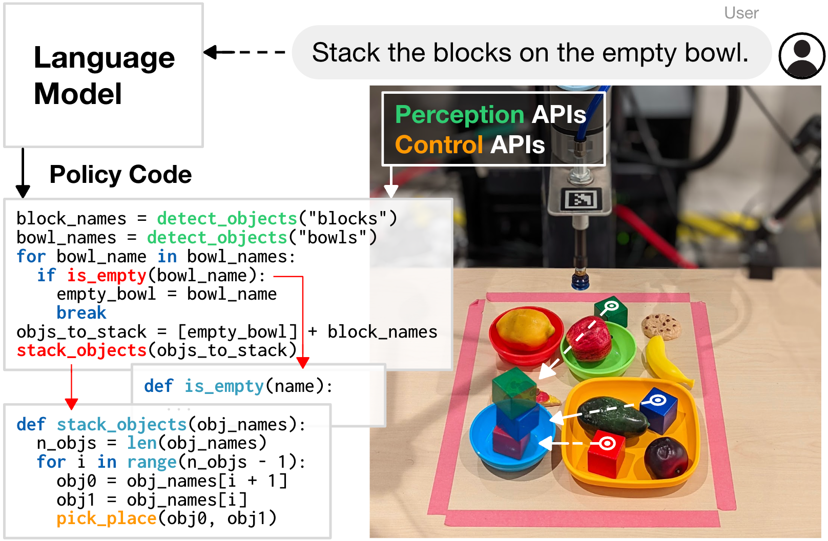 目前的语言模型不仅能高度熟练地编写通用代码,还能编写控制机器人动作的代码。当提供几个示例指令与相应的代码(通过上下文学习)配对时,语言模型可以接受新的指令,并自主地生成新的代码、重新组合 API 调用、为新任务合成新的机器人行为。