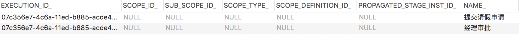 和前面的 SQL 相比,后面的 SQL 少了 WHERE RES.END_TIME_ is not NULL 条件,也就是说,判断一个流程是否执行完毕,就看它的 END_TIME_ 是否为空,不为空就表示流程已经执行结束了,为空就表示流程尚在执行中。