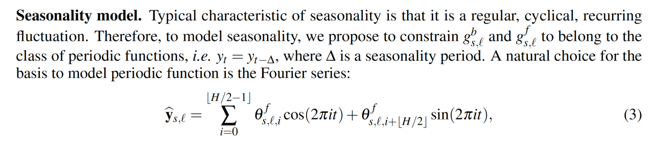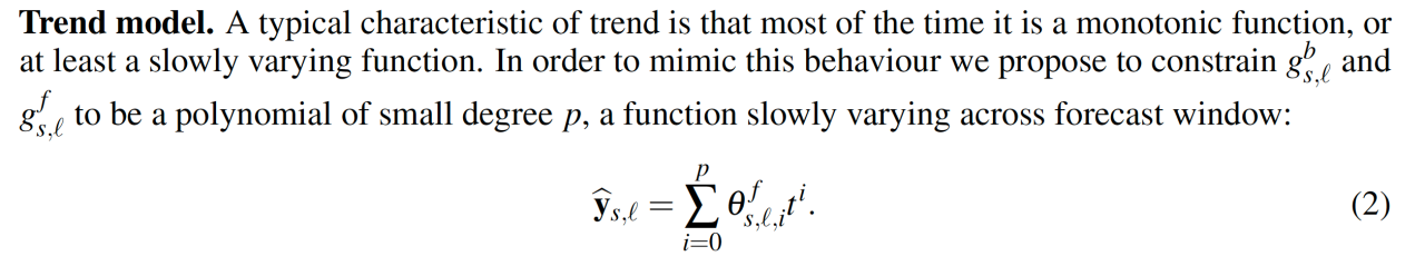 为解决深度学习在做时间序列预测时可解释性不强的问题,该模型作者采用了两种方法。如下图所示,假设该模型只设计两个 Stack,一个 Stack 用于输出该模型的趋势,另一个 Stack 用于输出该模型的周期。在 Stack 用于输出趋势时,该 Stack 输出的值作为多样式的系数,随后用该多样式函数来拟合它的趋势。相对来说,这种方法是较为原始的。