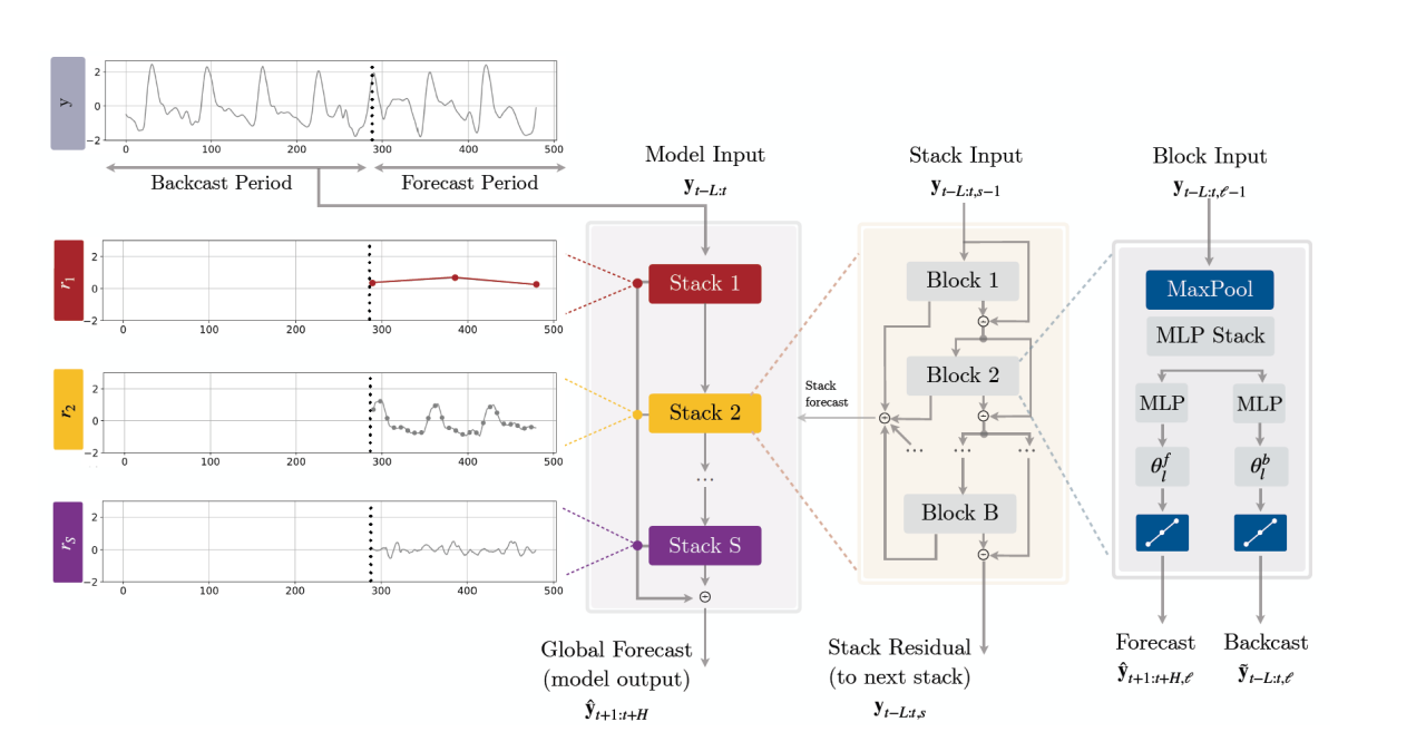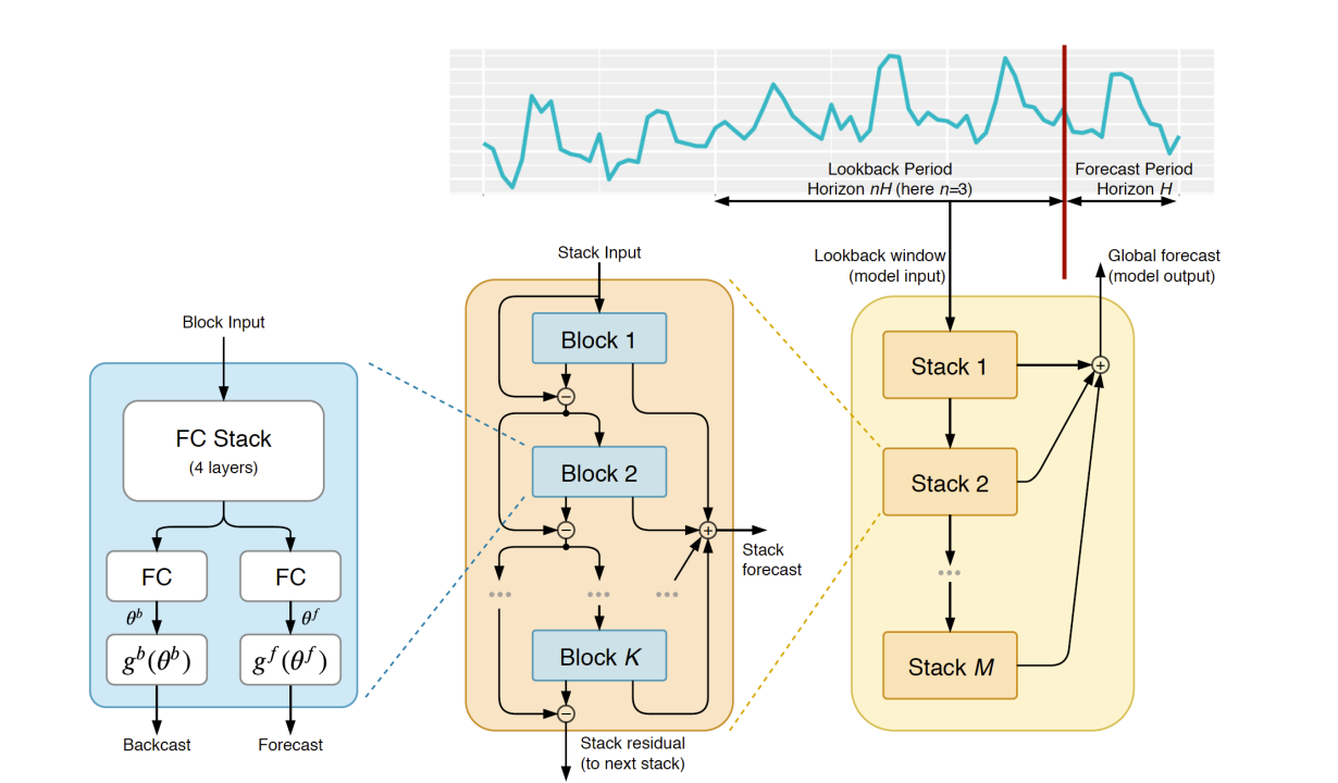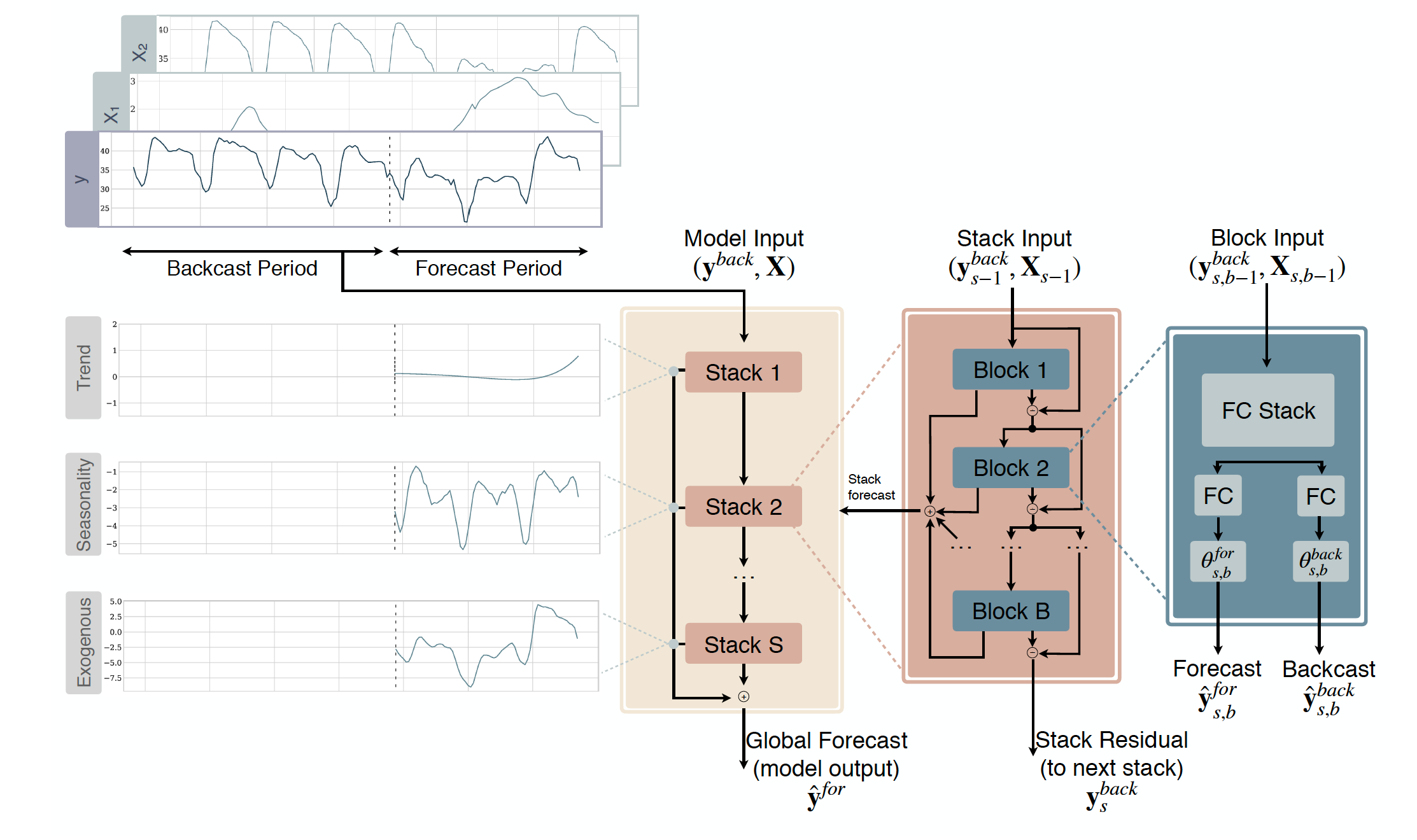 由于 N-BEATS 只能进行单指标时间序列预测的问题,因此,N-BEATSx 在 N-BEATS 的基础上对神经网络做了部分改动以实现多指标时间序列预测。即在预测过程中,输入的值不局限于时间序列,也可以是外部变量,以此实现多对一的预测。如下图所示,N-BEATSx 模型的网络架构与 N-BEATS 基本一致,没有出现额外的变化。即 N-BEATSx 可以理解为加了外部变量的 N-BEATS。