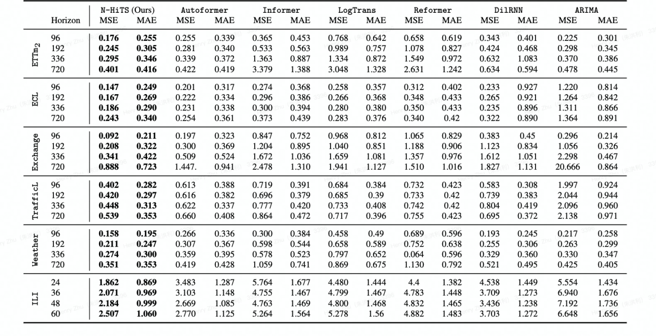 下图为 N-HiTS 模型预测结果对比图,可明显看出好于 Informer、Autoformer 以及 ARIMA 等模型。