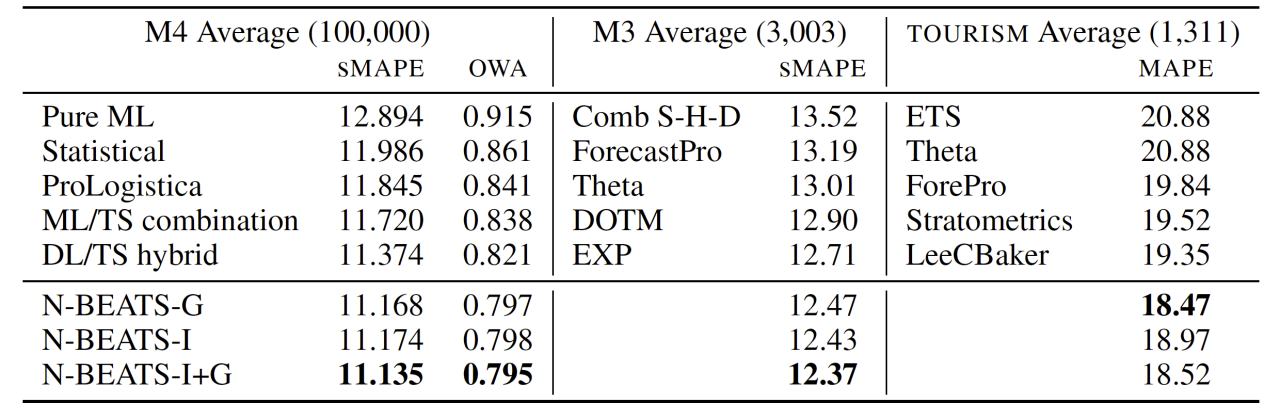 下图为 N-BEATS 模型在 M4、M3 以及其他数据集上的一些表现。可以看出, 相比与深度学习、时间序列等其他模型,N-BEATS 模型在部分指标下的结果是较为显著的。