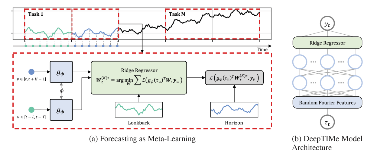 DeepTiMe 模型利用了元学习模型的思想,是一个基于 Time-Index 的模型。下图为 DeepTiMe 模型网络架构,DeepTiMe 也利用了随机傅立叶特征。首先传递一个 Time-Index 告知今天是几号,随后预测出yt。上述便是 DeepTiMe 模型网络整体输入输出流程。