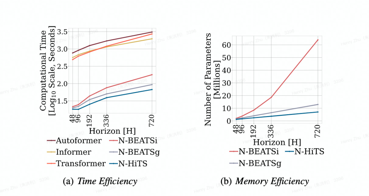 下图为 N-HiTS 模型的计算复杂度与空间复杂度。可看出基于 N-HiTS、N-BEATS 以及 N-BEATSx 的时间复杂度要远远低于 Transformer 等模型的复杂度。且在空间复杂度上面, N-HiTS 模型甚至比N-BEATS 模型还要低一些。