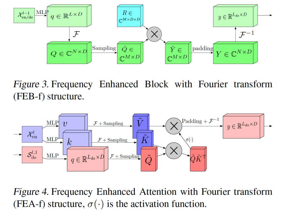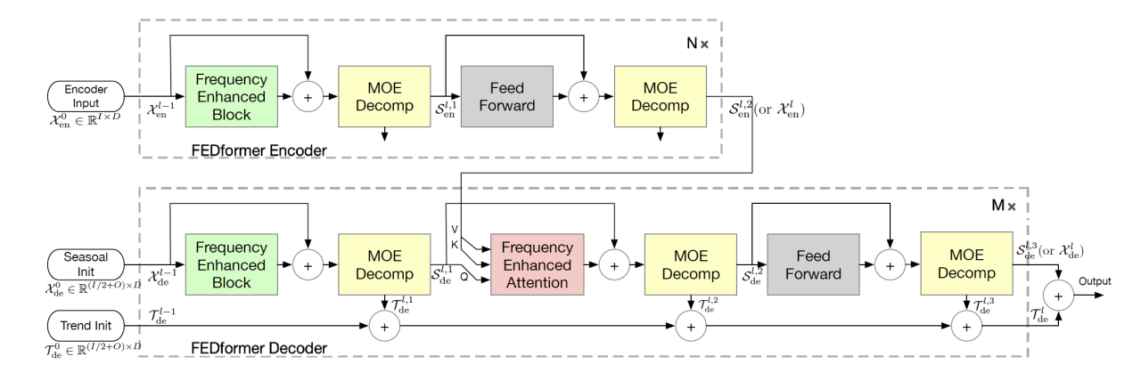 FEDformer 模型主要采用了 Transformer 模型的结构,在此基础上提出了两个创新点。第一个创新点是频率增强捕捉机制,第二个创新点是基于频率增强的注意力机制。频率增强捕捉机制与频率增强的注意力机制有傅立叶变换和小波变换两个版本。