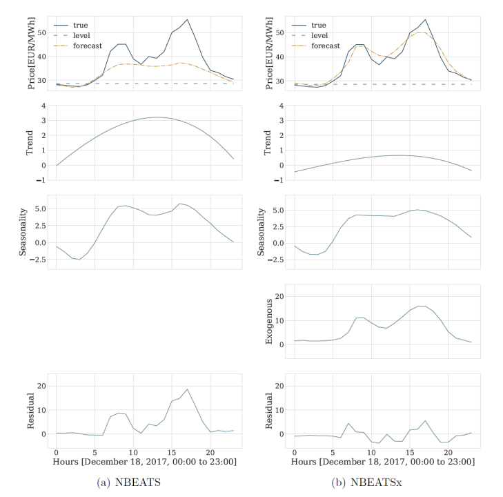 如下图所示,左侧是未输入外部变量的 N-BEATS,残差较大。右侧是加了外部变量的 N-BEATSx,预测结果更准确。