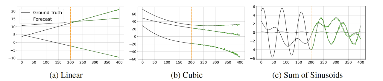 下图为使用 DeepTiMe 模型预测线性、三次多项式等模型的预测结果,可以看出 DeepTiMe 模型在该方面的预测结果也较为精准。