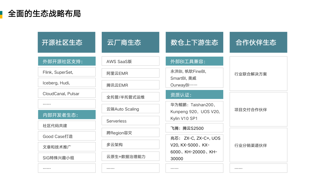 其他特性:第一是安全稳定。第二是生态相对来说比较完善,因为 StarRocks 两年多的积累,再加上各个生态合作伙伴的鼎力支持,融合了非常多上下游的产品和技术,从而能够给企业提供相对完善的解决方案。第三是完全自研自主可控,原厂有丰富的基础知识和培训,因此我们可以做到 7x24小时,全天候应急响应,节假日不休。全国在六地有研发中心和知识中心,特殊需求可以派专家去现场保驾护航。